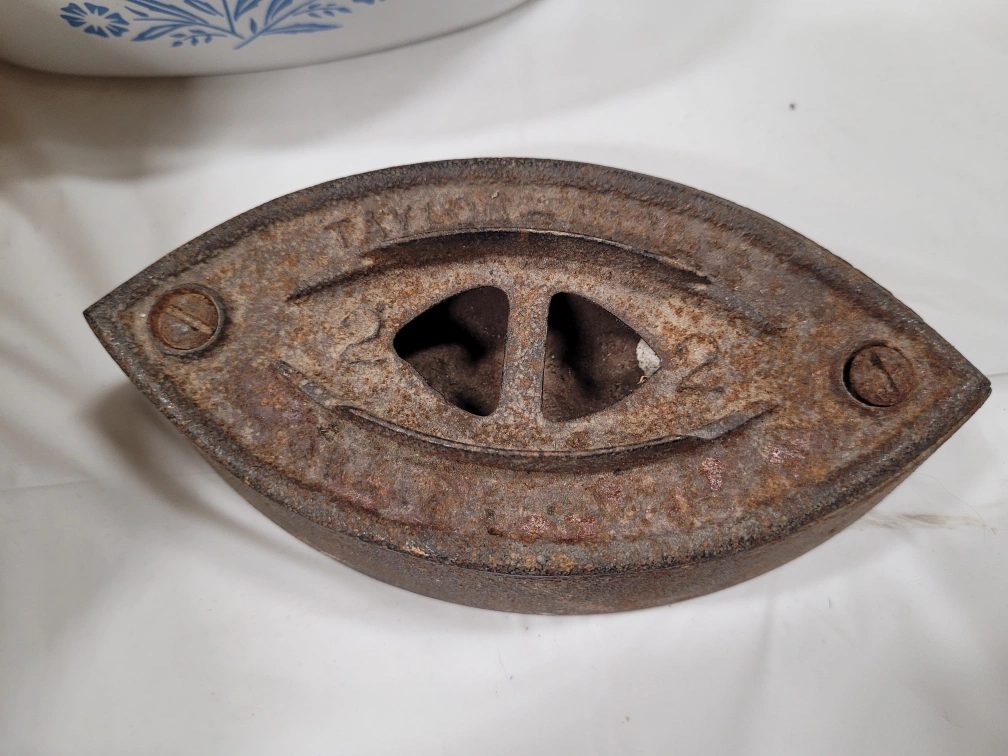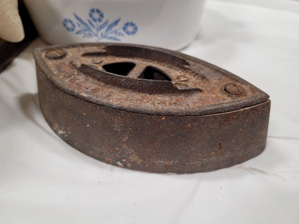 great door stop! Vintage sad iron. Shows significant wear and rust. Great for collectors or display. Sold as is. with no handle