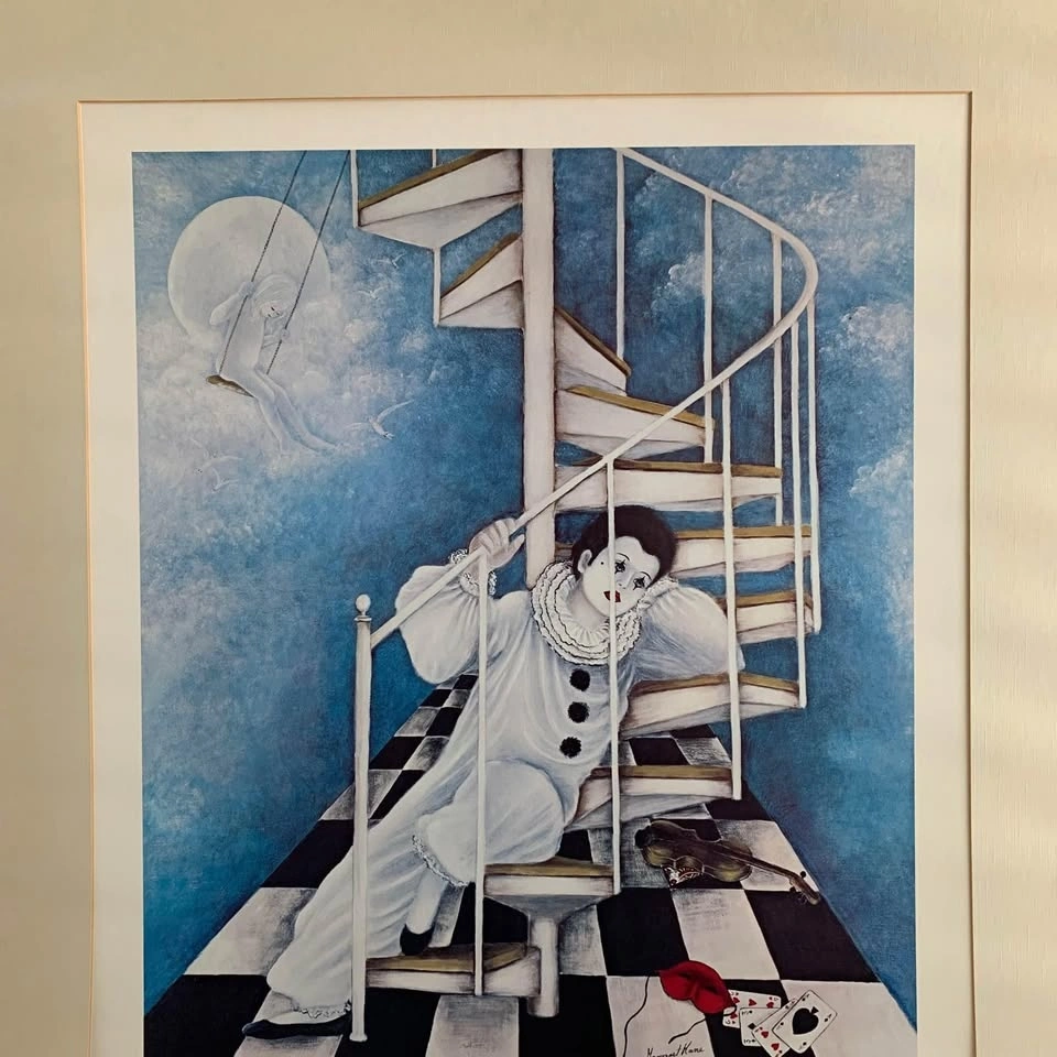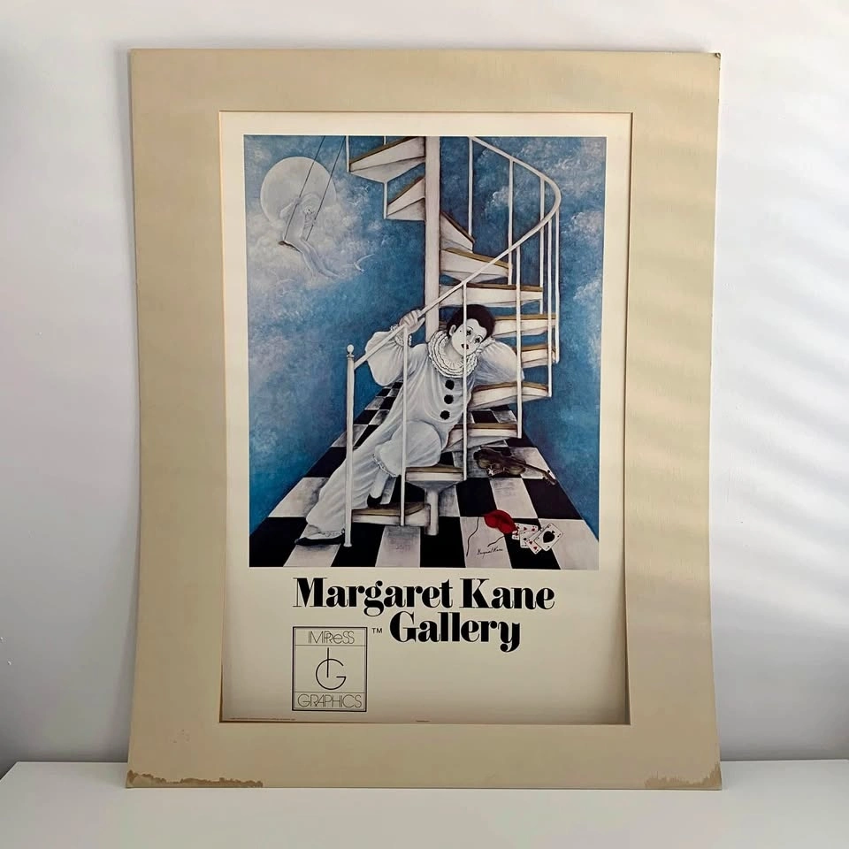 Clown on Staircase by Margaret Kane. Ready to frame. In good vintage condition