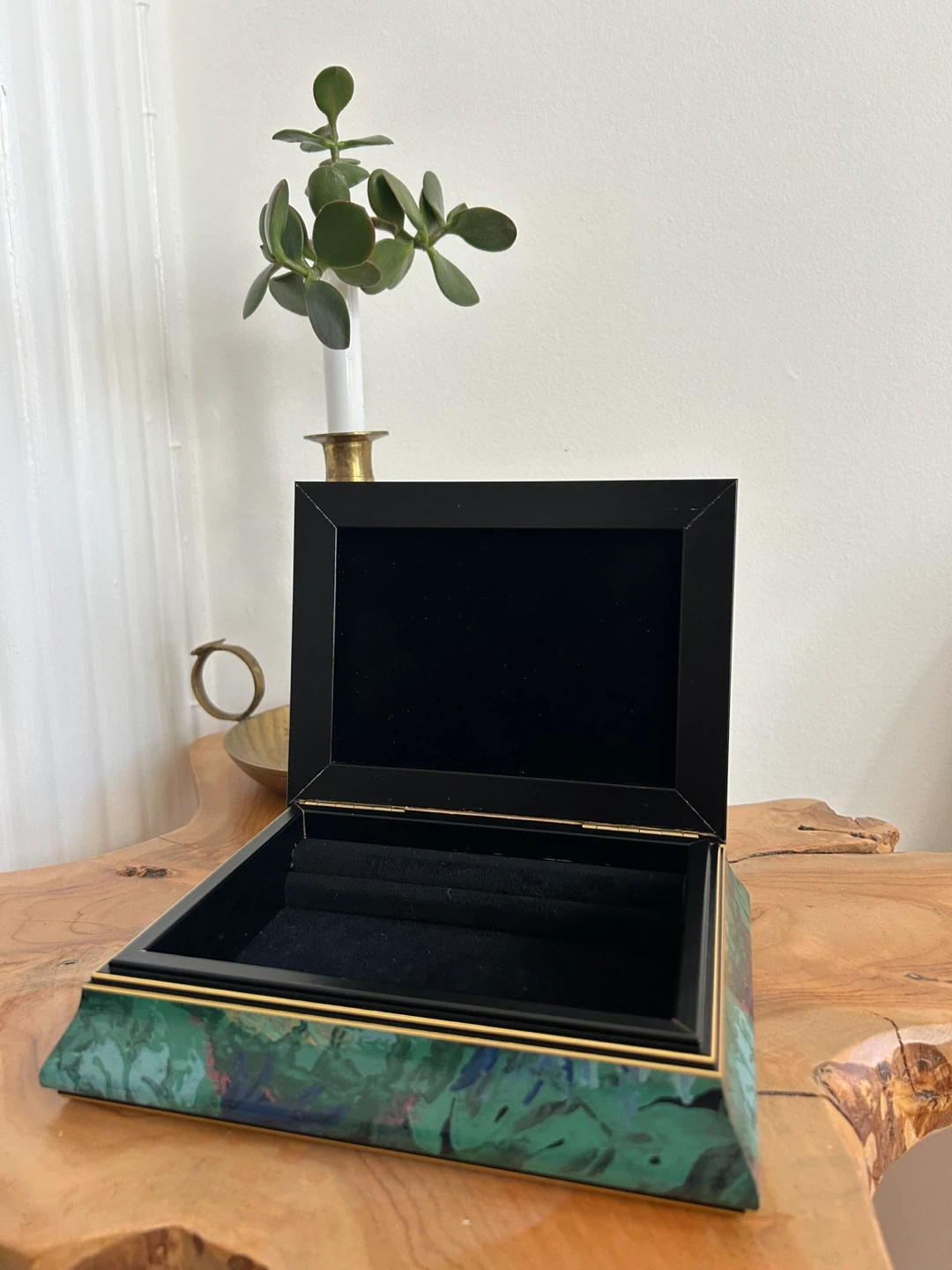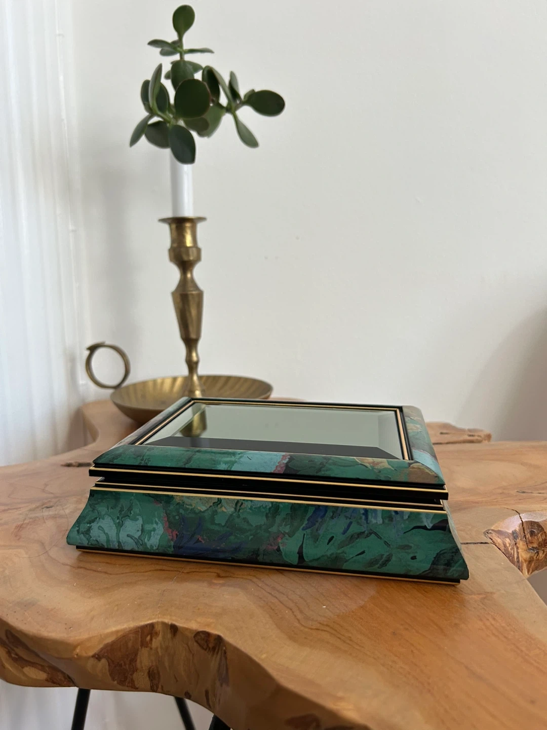 Gorgeous vintage jewelry box in a faux malachite lacquer finish. Rich green tones with gold accent banding. The hinged lid opens to a beveled mirror and a black velvet interior perfect for storing jewelry or small keepsakes. Excellent vintage condition, est. 1980s–1990s.