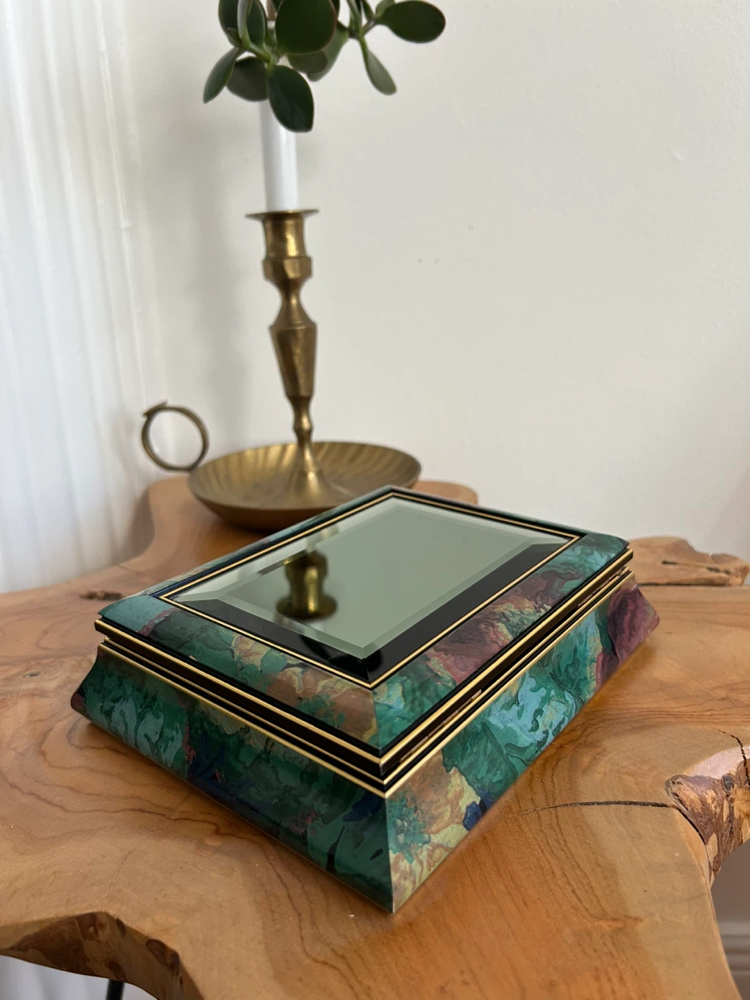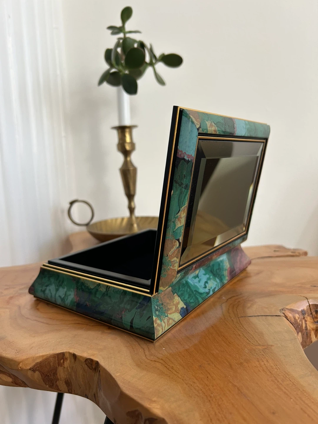 Vintage Faux Malachite Lacquer Box with Mirror Lid