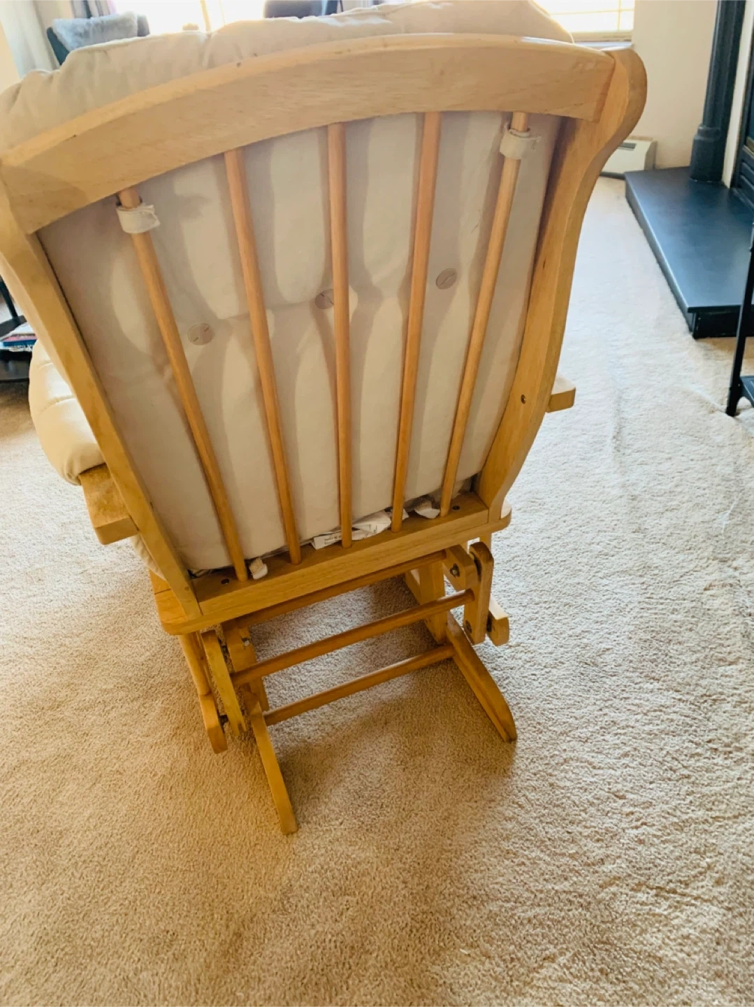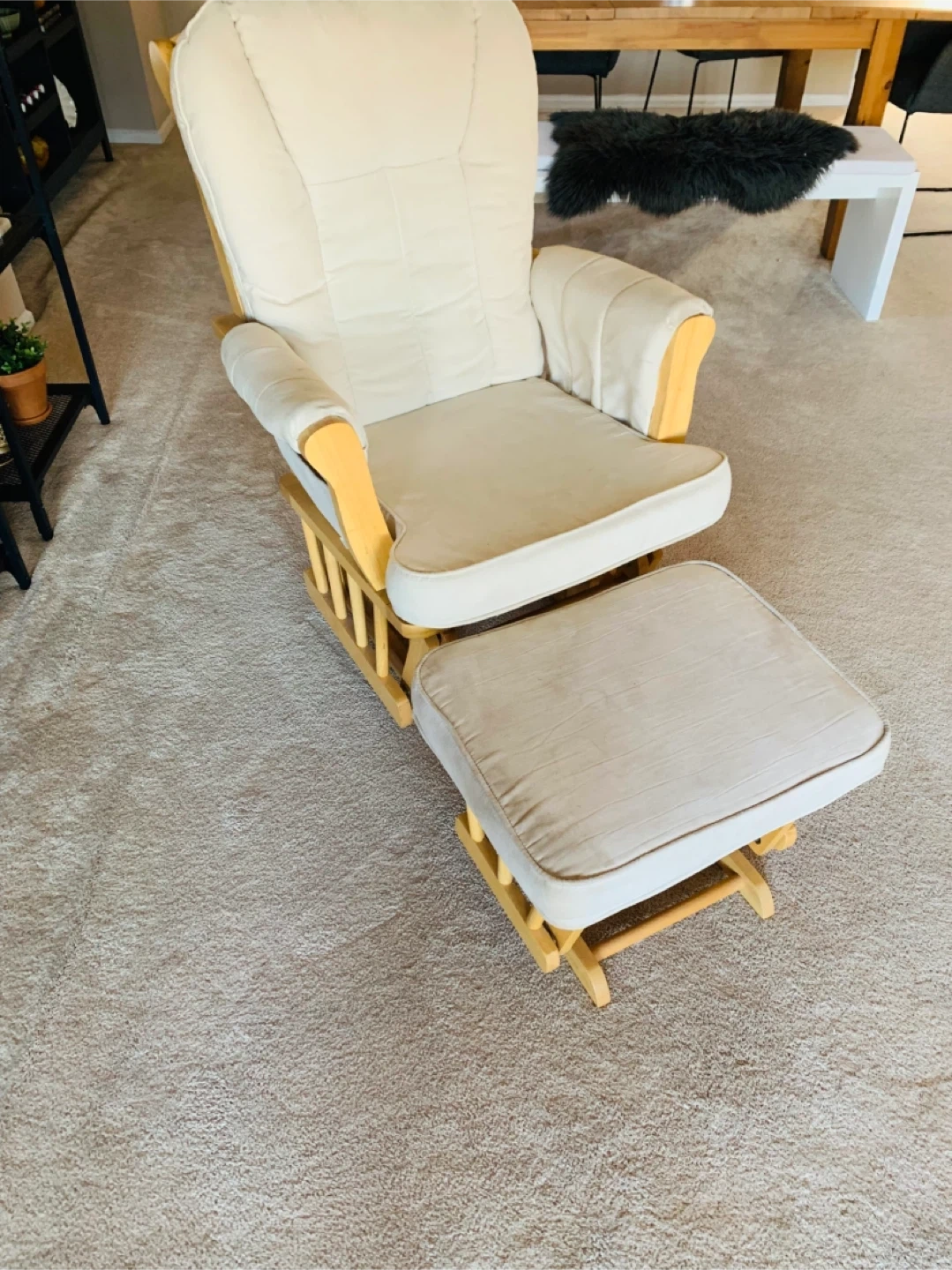 Cream upholstered glider chair and matching ottoman set. Features a wooden frame with natural finish. Comfortable padding for relaxation. Perfect for a nursery or living room!