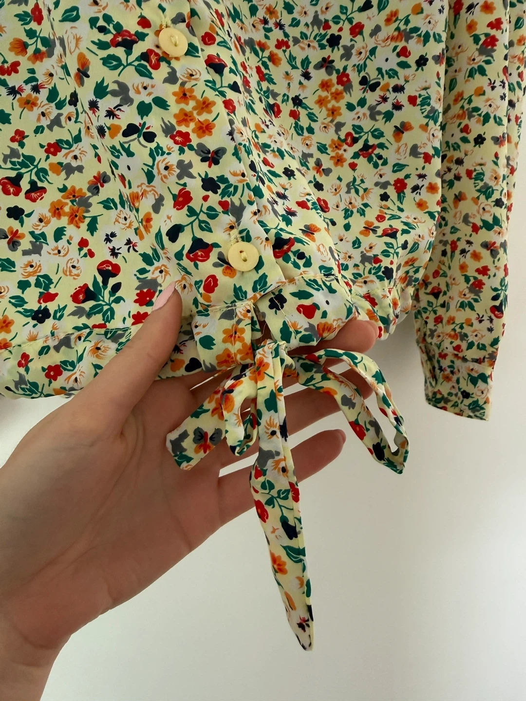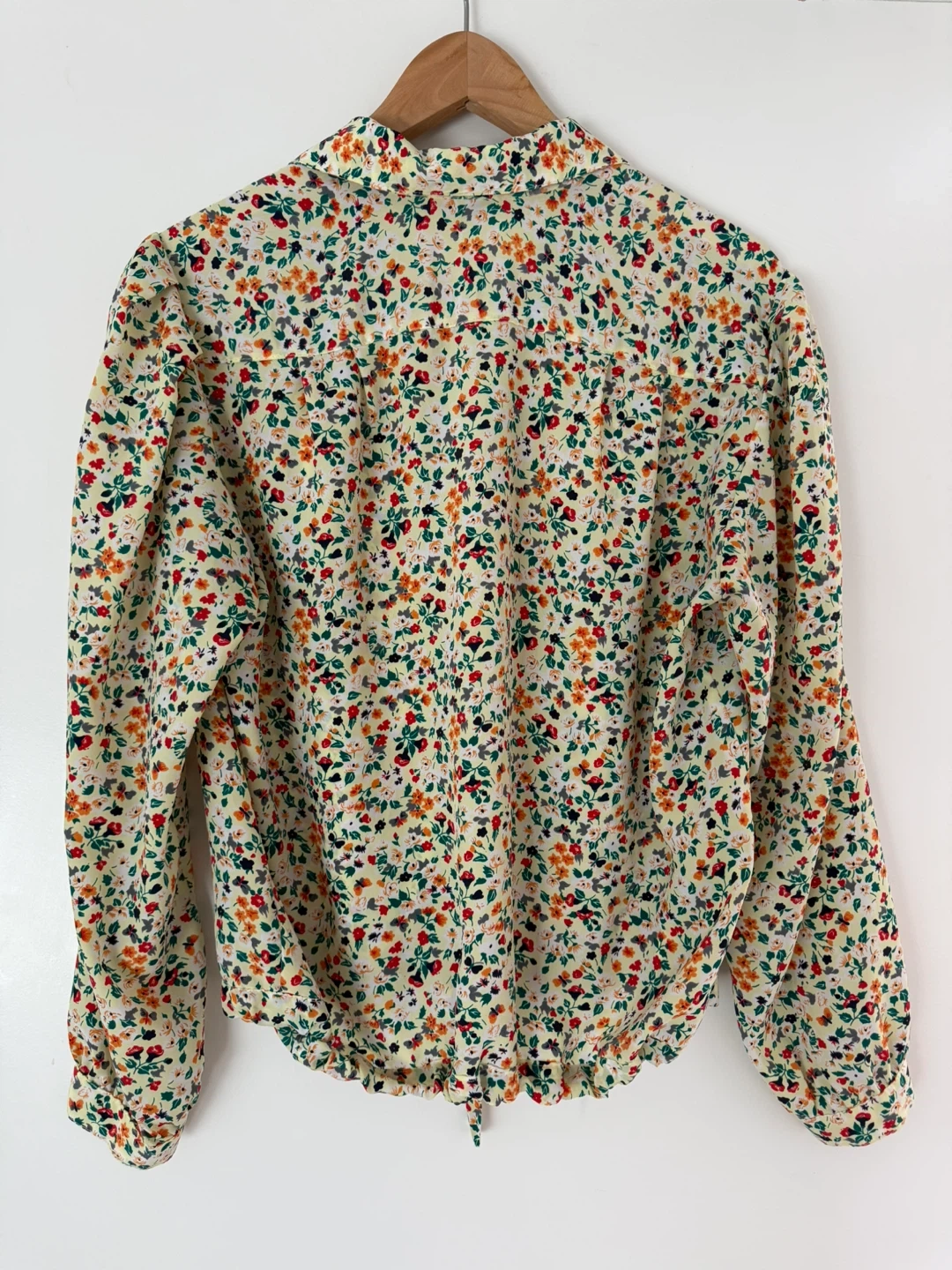 Vintage springtime light yellow blouse with a colourful floral print. 💐 It features a tie detail at the hem which can be used to adjust the size. This shirt is manufactured in France!! Fits a size small-medium.