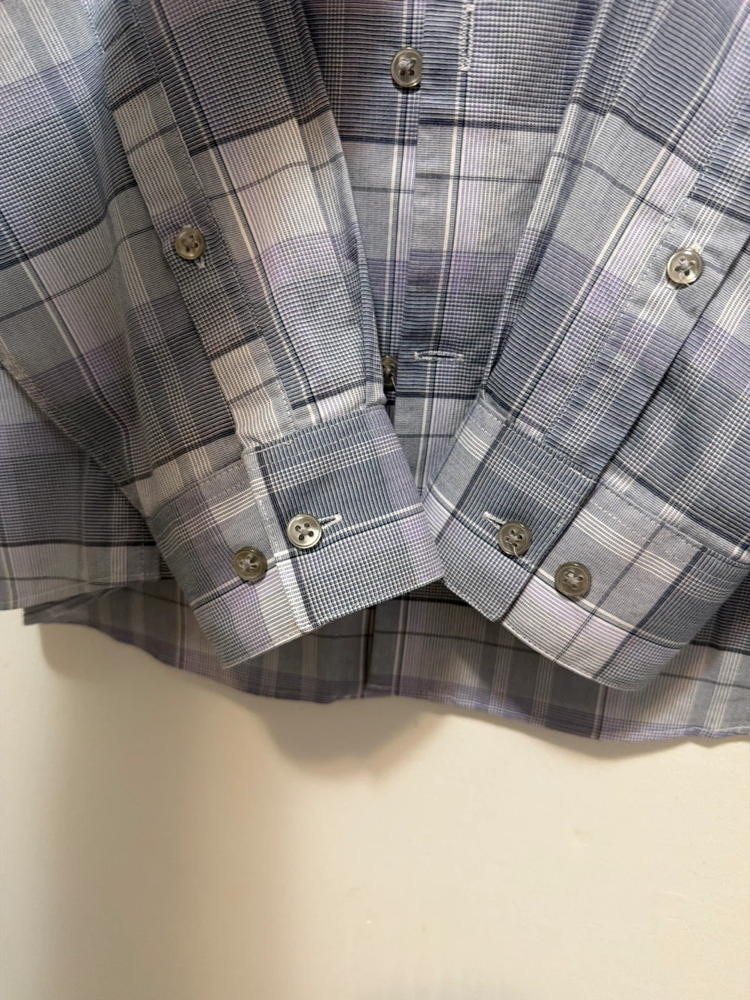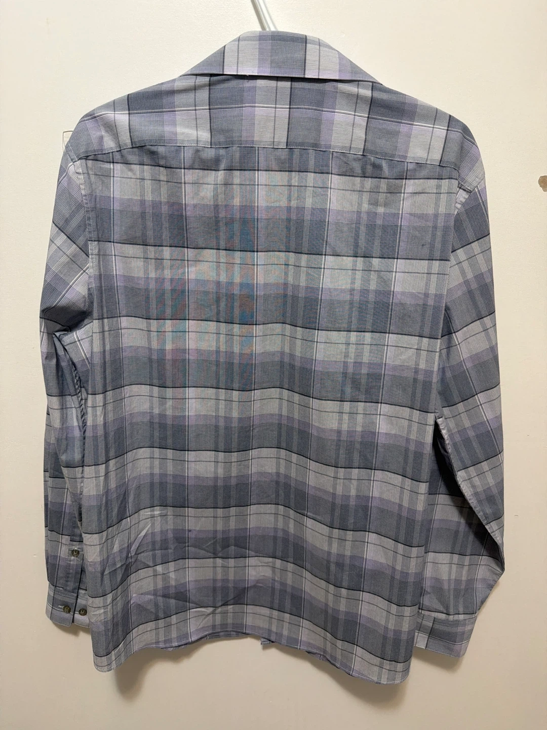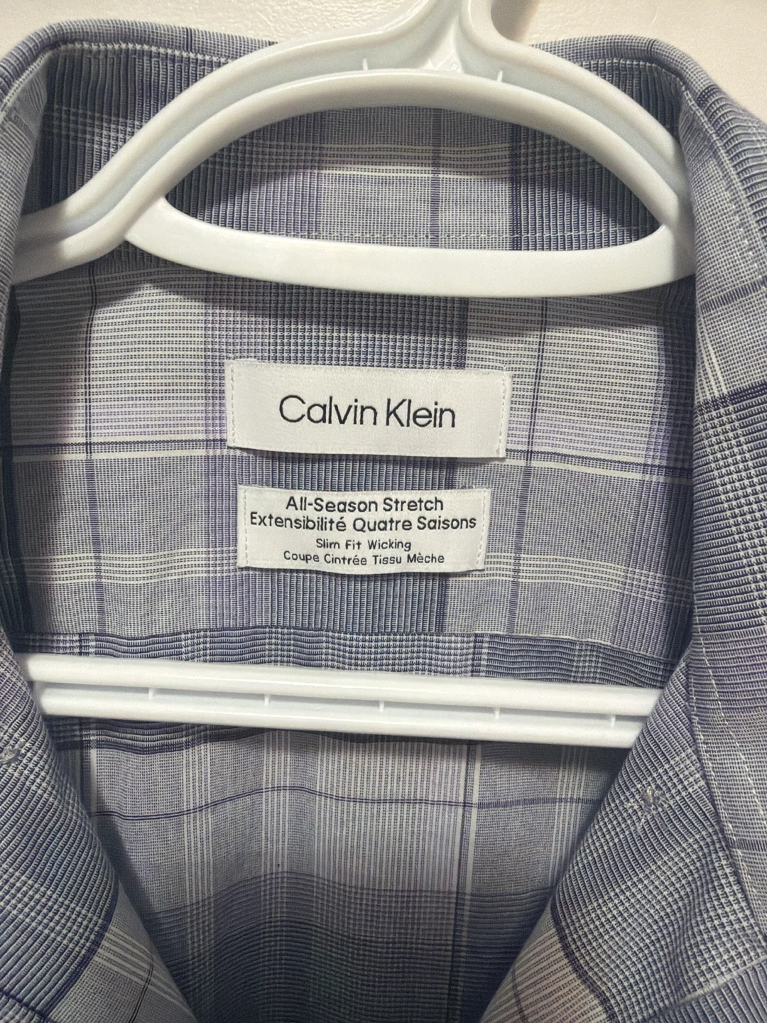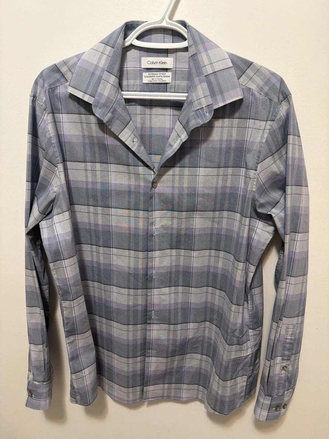 This Calvin Klein dress shirt features an All-Season Stretch Slim Fit design with a wicking fabric. It has a classic plaid pattern with purple and grey tones. The shirt is designed for comfort and ease of movement.