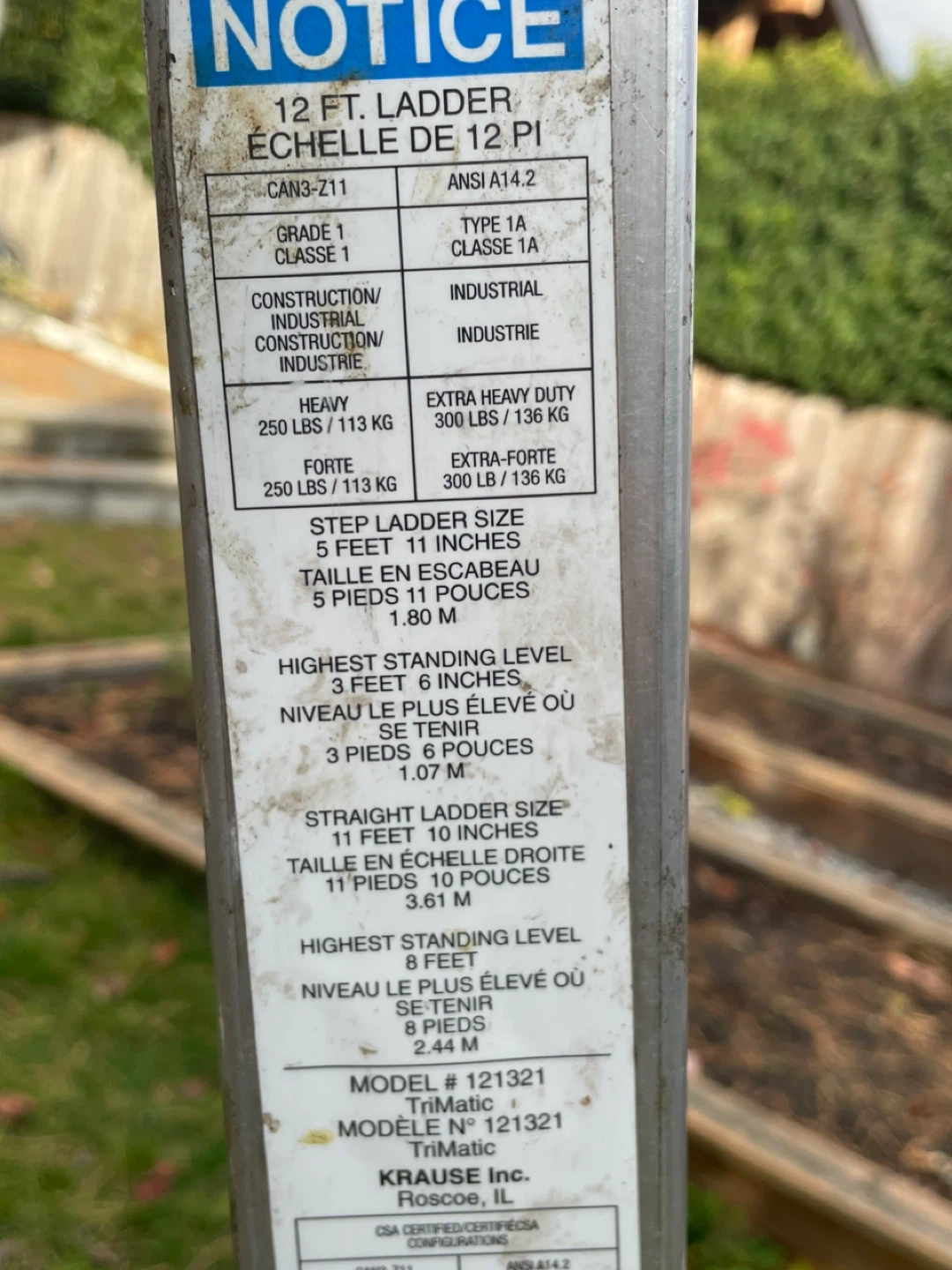 10Selling a Krause 12 ft ladder, TriMatic model. It's in great condition and ready for your next project! Key specs: - 12 ft ladder - Step ladder size: 5 feet 11 inches (1.80 m) - Straight ladder size: 11 feet 10 inches (3.61 m)