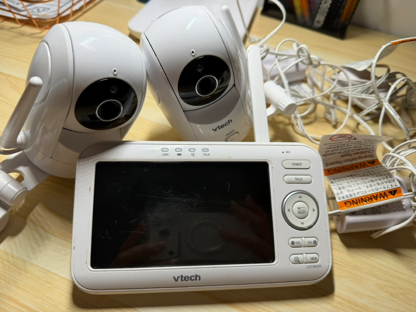 This Vtech baby monitor comes with two cameras and a parent unit. It's designed for keeping an eye on your little one. The model is VM5262-2.
