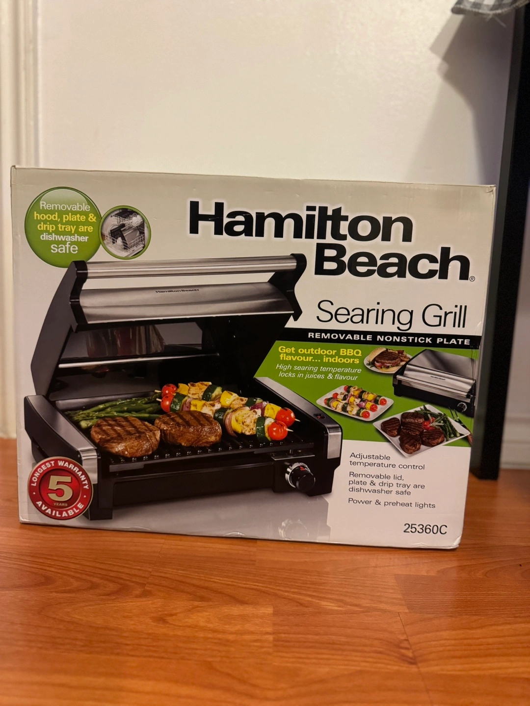 Indoor searing grill. Removable nonstick plate. Adjustable temperature control. Removable lid, plate and drip tray are dishwasher safe. Power and preheat lights.