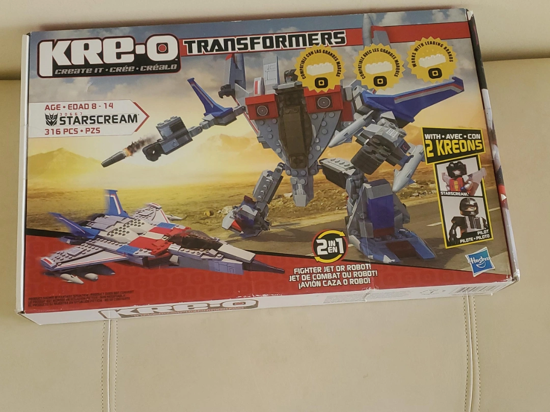Selling a Kre-O Transformers Starscream set! It's suitable for ages 8-14 and includes 316 pieces. It can be built as either a fighter jet or a robot. The set also comes with 2 Kreons (Starscream and Pilot).