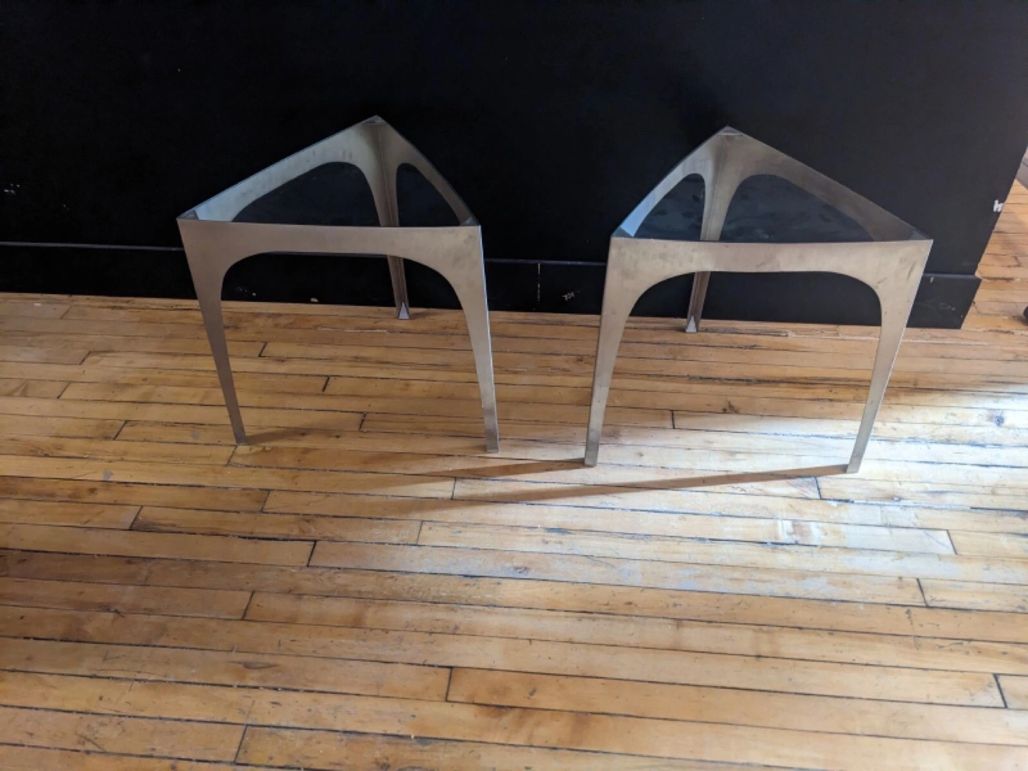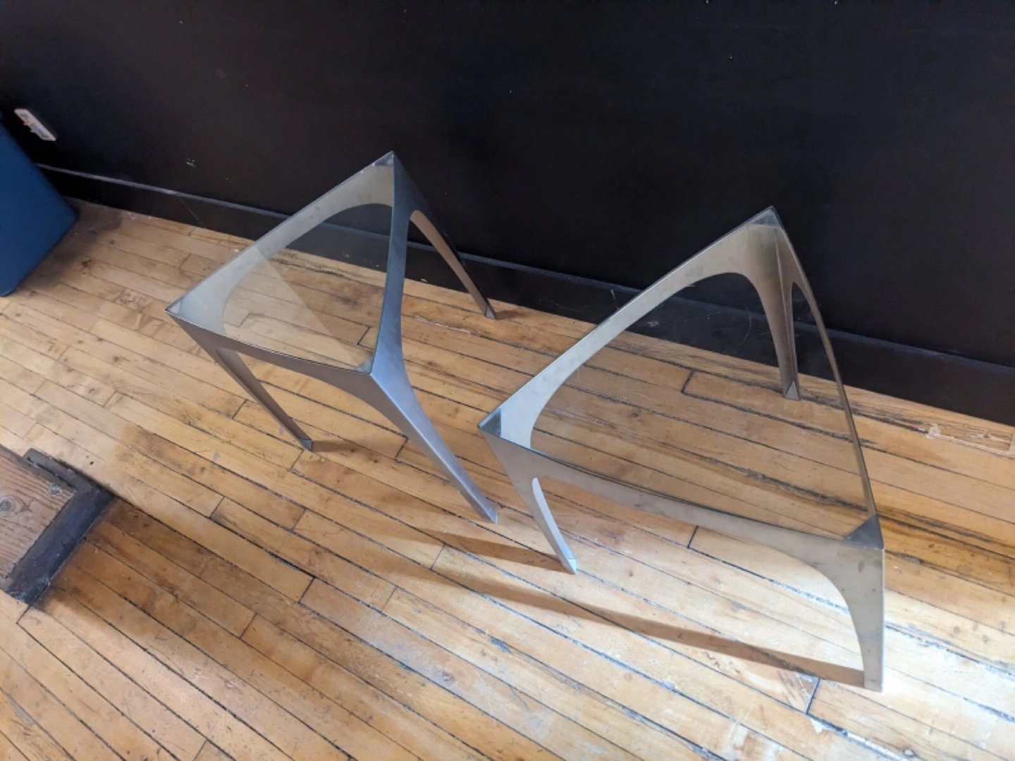Unique pair of triangular side tables. Metal frame, glass top. Excellent for a modern or vintage decor. Stylish and functional.