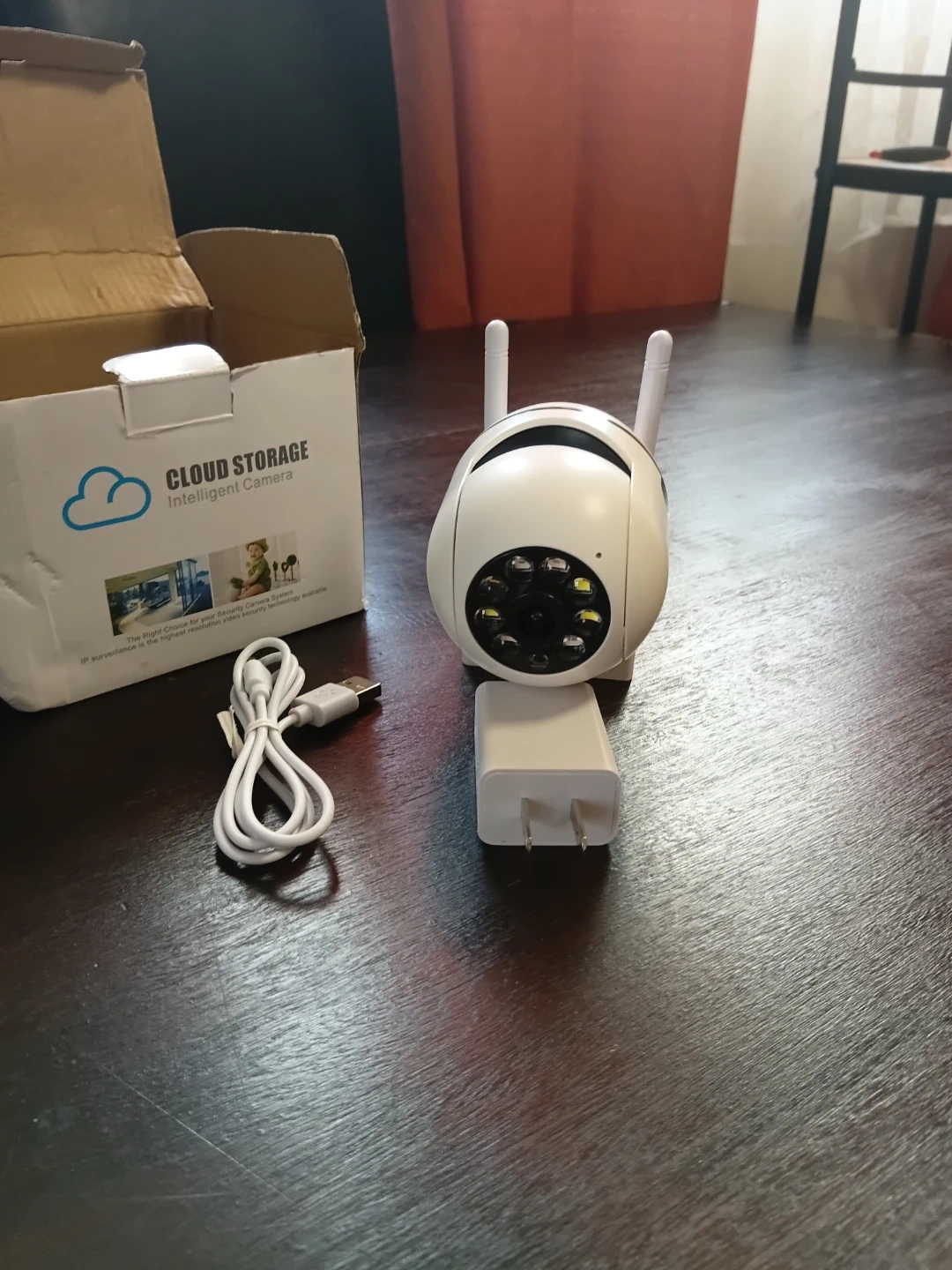 This is a white intelligent camera with cloud storage capabilities. It includes a USB charging cable and power adapter. The camera also features two antennas for better signal reception. It's designed for IP surveillance with high-resolution video.