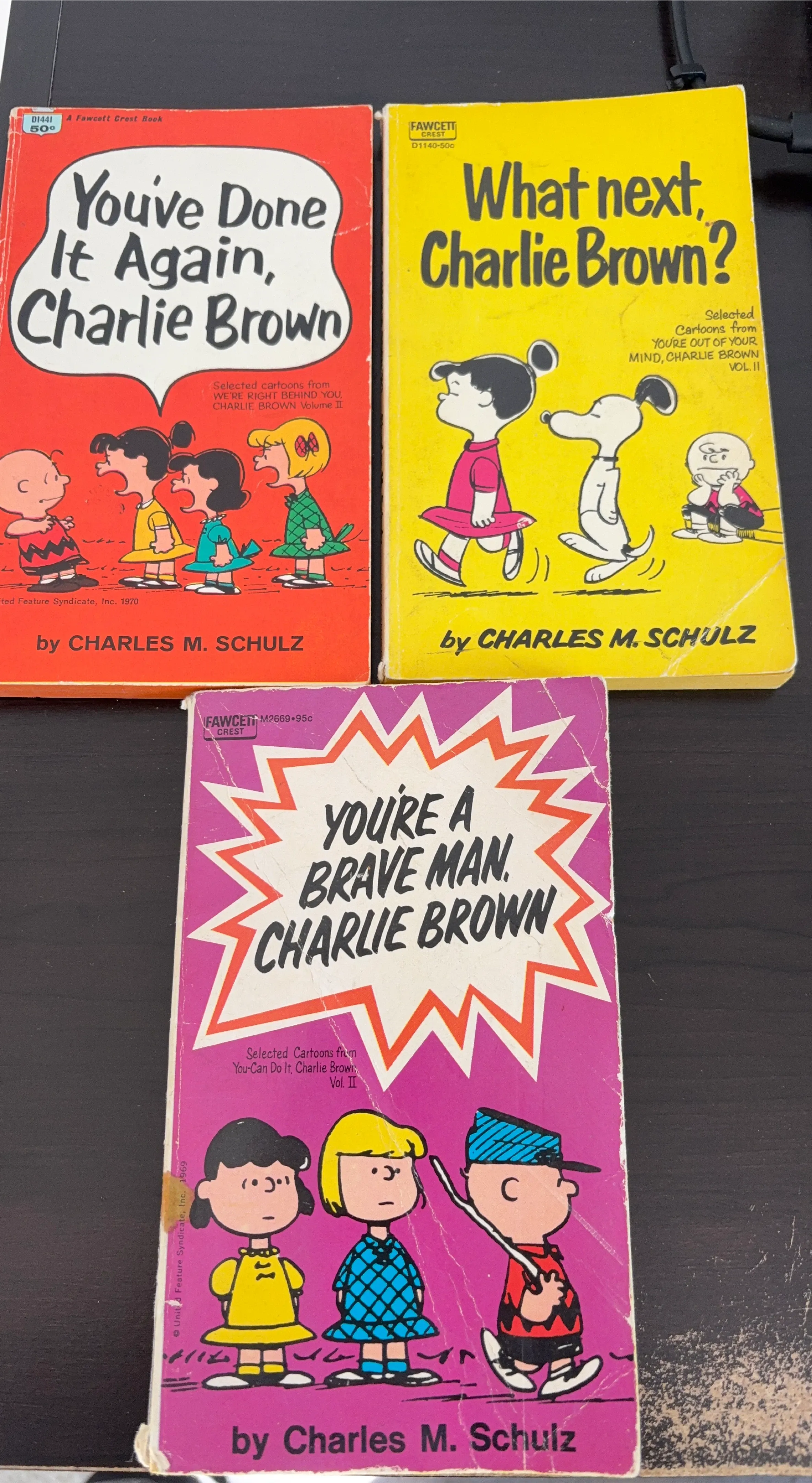Three classic Peanuts comic books featuring Charlie Brown. Titles include 'You've Done It Again, Charlie Brown', 'What Next, Charlie Brown?', and 'You're a Brave Man, Charlie Brown'. These are collected cartoons by Charles M. Schulz. A great addition for any Peanuts fan!