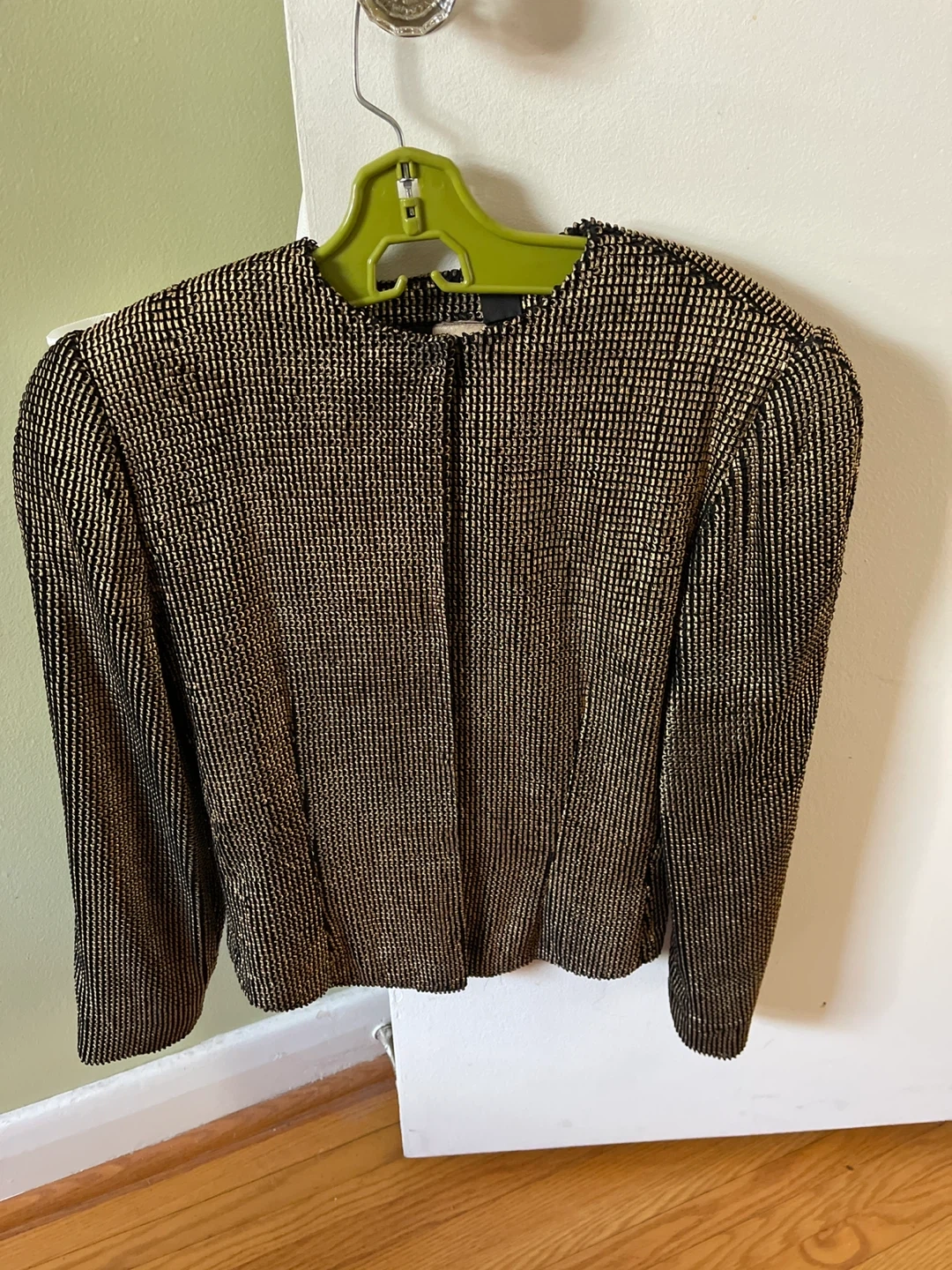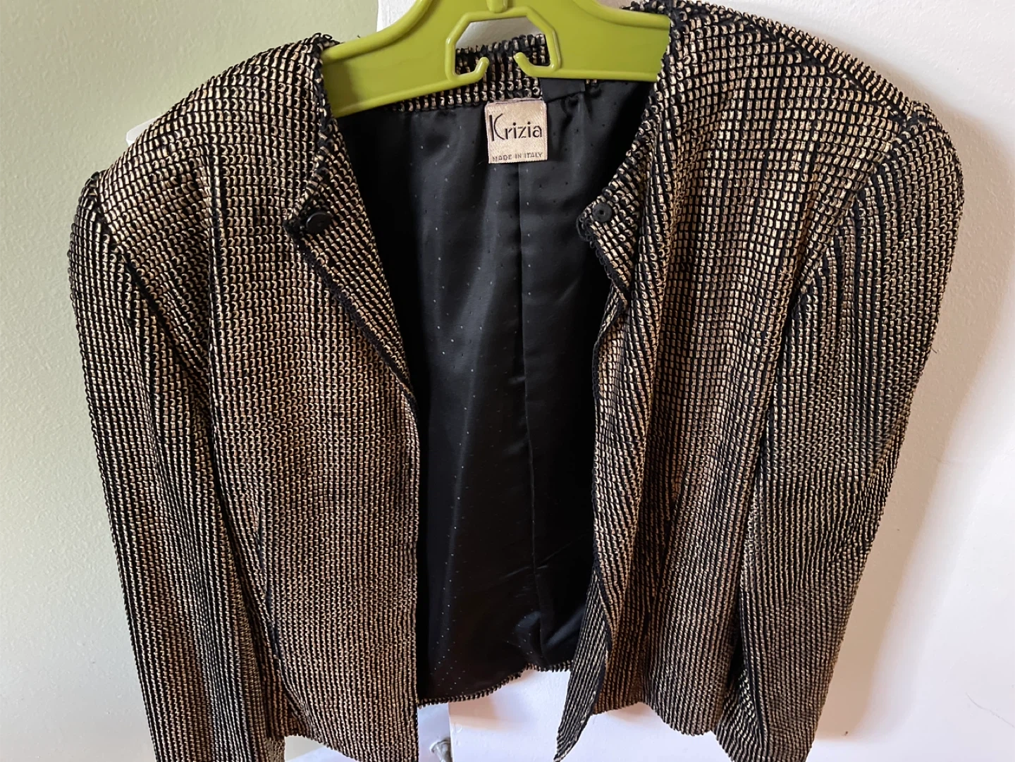 Selling a Krizia blazer in a stylish black and gold colour. It's made in Italy and has a unique textured pattern. Perfect for adding a touch of elegance to any outfit!
