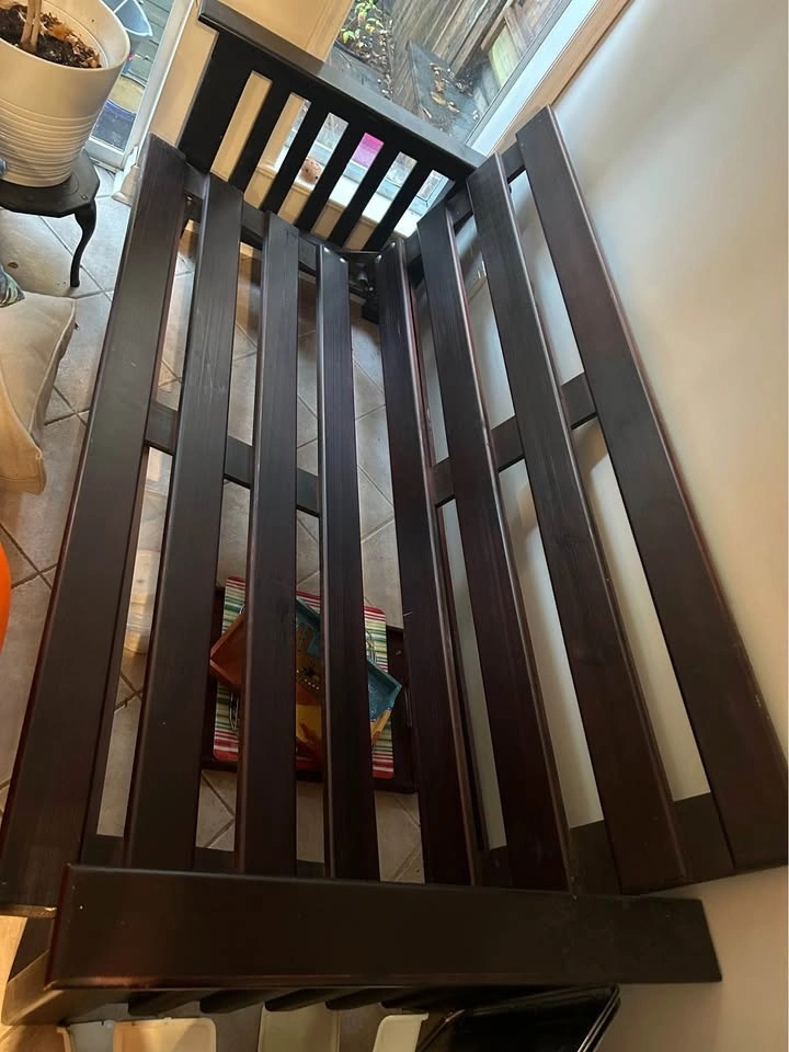 Used it in the kitchen as a sofa. Never slept on it. It has a couple of marks on the wood and the cushion has a small stain that might come out with washing. The cover is removable for washing and the cushion can be flipped over.