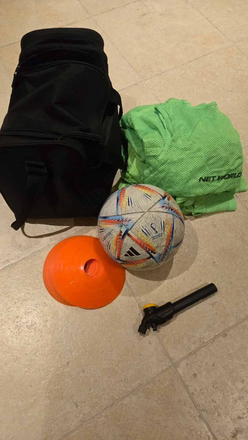 Used Soccer training bundle: includes 10 training jackets, Adidas ball, portable air pump, training cones, and a small duffel bag