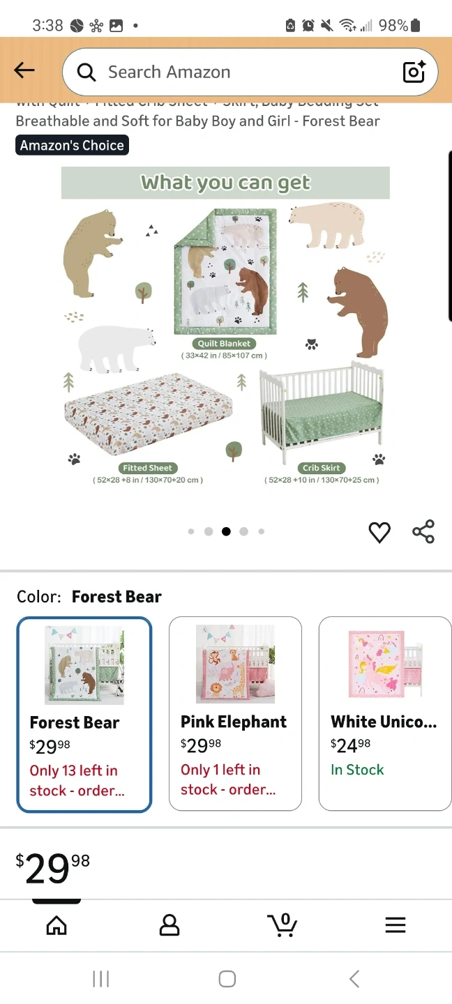 It's a 3-piece baby crib bedding set with a forest bear theme. Includes a quilt blanket, fitted sheet, and crib skirt.