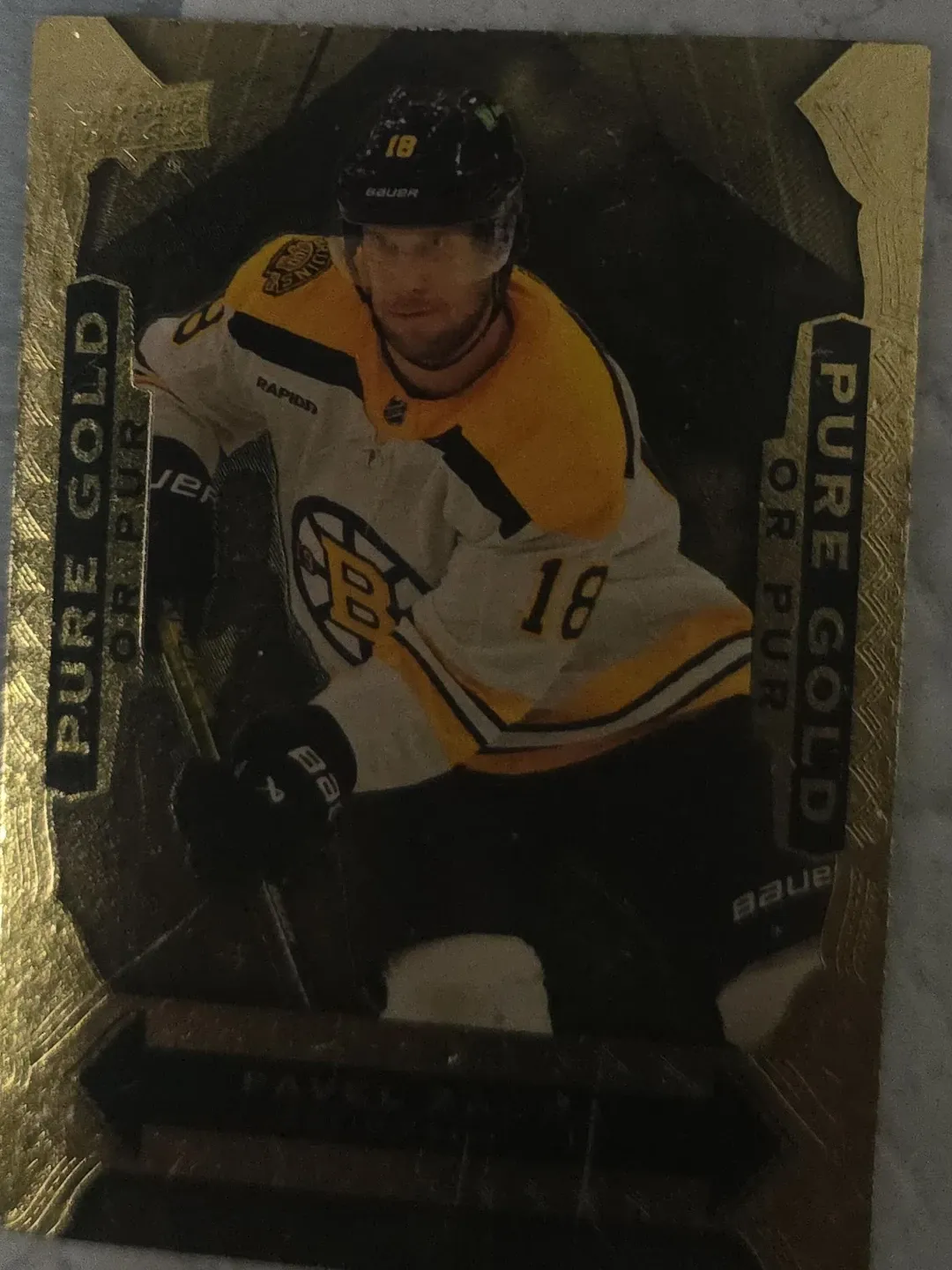 Pavel Zacha hockey card with "Pure Gold" on the side. Card features the player in his Boston Bruins jersey. Player number 18 is visible.