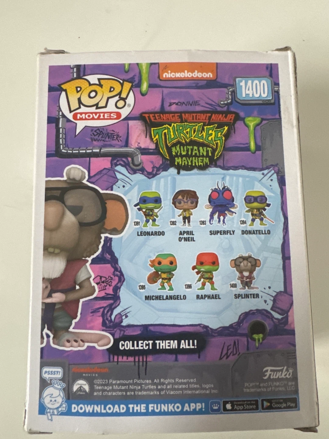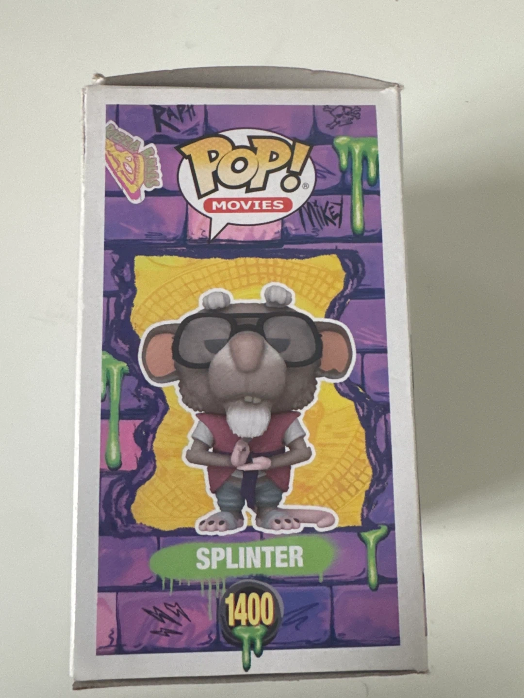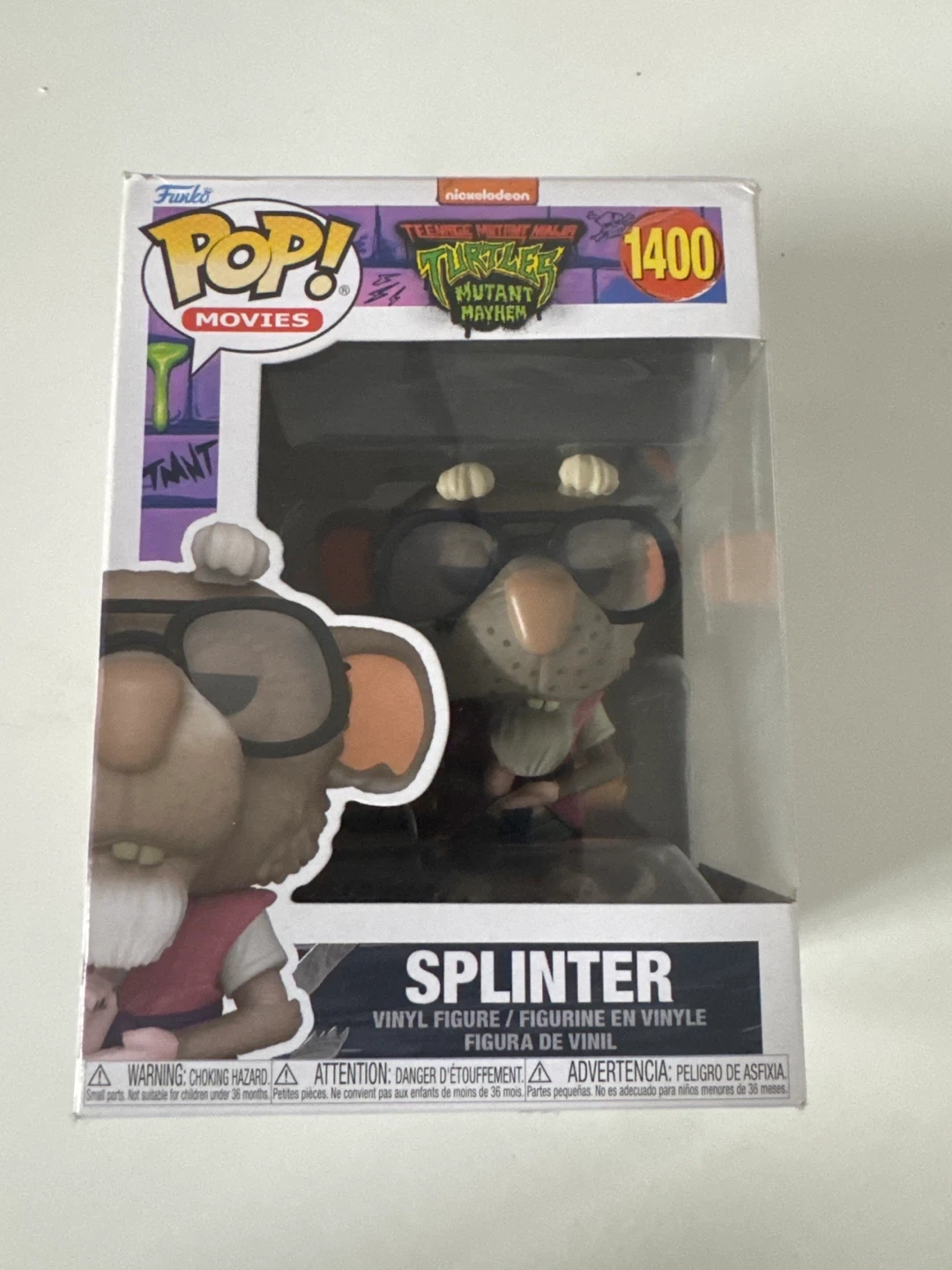 This is a Funko Pop! Movies vinyl figure of Splinter from Teenage Mutant Ninja Turtles: Mutant Mayhem. It's figure number 1400 in the collection. This collectible is a great addition for any TMNT fan!