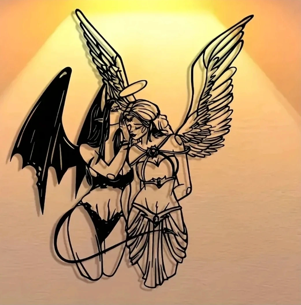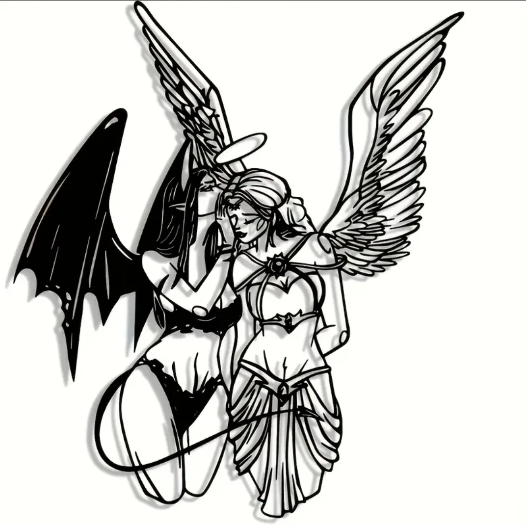 This metal wall art features a striking depiction of an angel and a demon. It's approximately 11.81 inches tall and 10.23 inches wide. This unique piece would add a touch of gothic or fantasy art to any room!