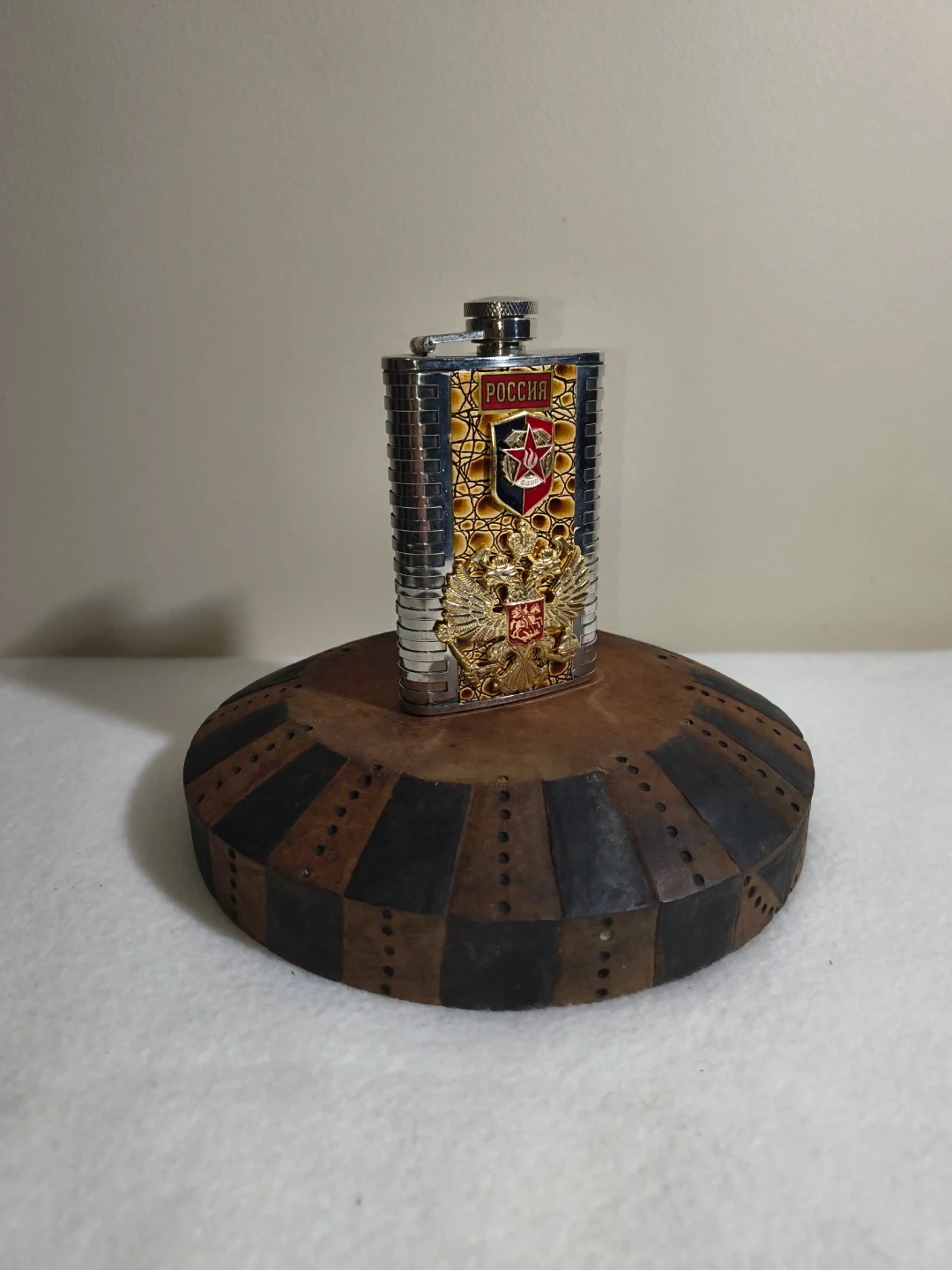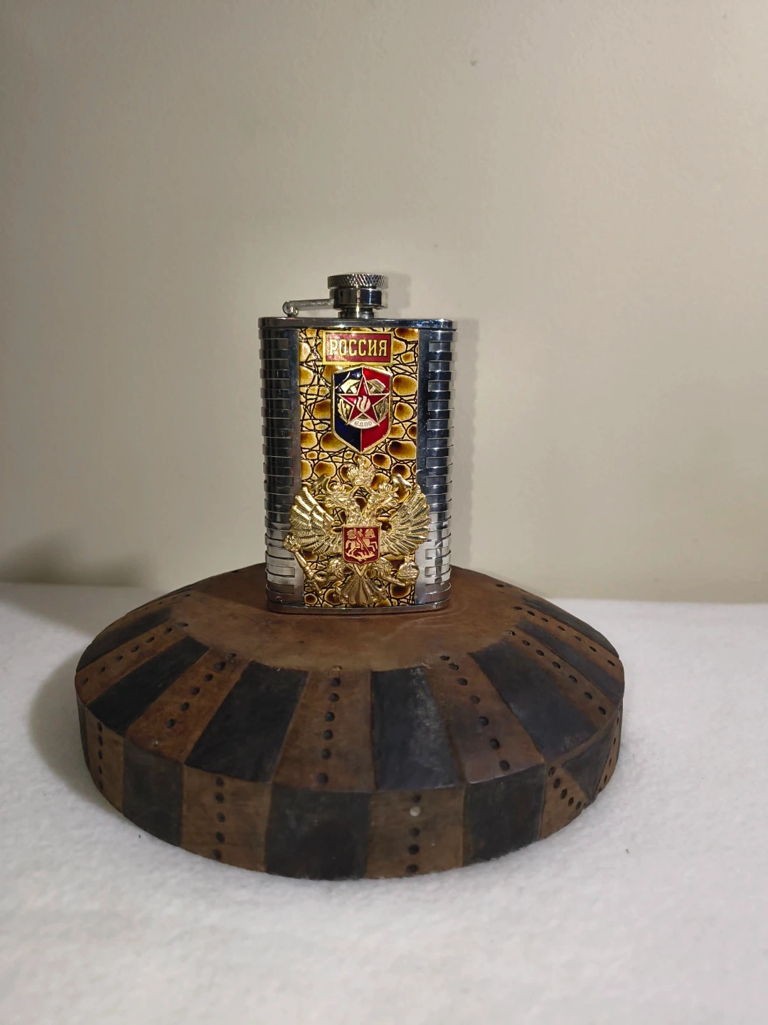 Decorative 5oz stainless steel flask with Russian crest and enamel-style front. Screw-top lid attached. Clean interior, great condition.