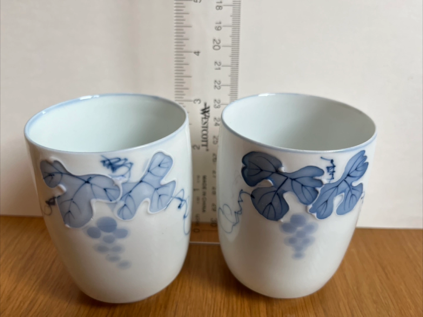 Elevate your tea or sake experience with this elegant set of two Japanese porcelain cups, each adorned with delicate blue grape vine designs. These cups are brand new and in original box.