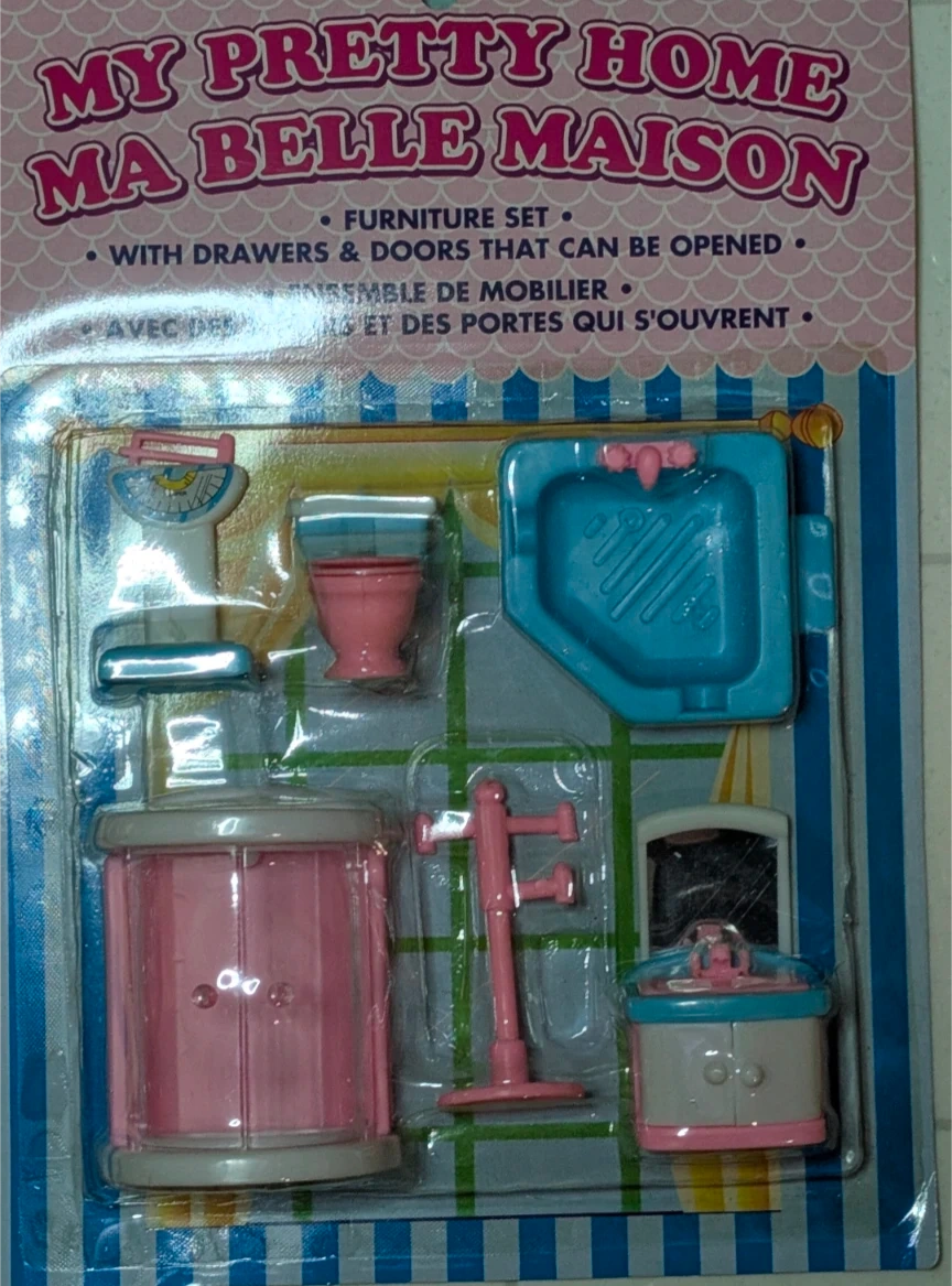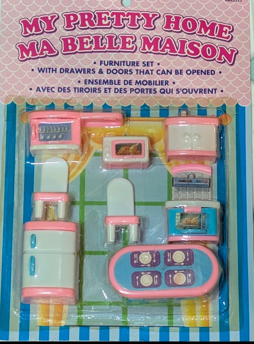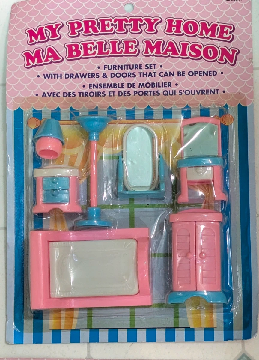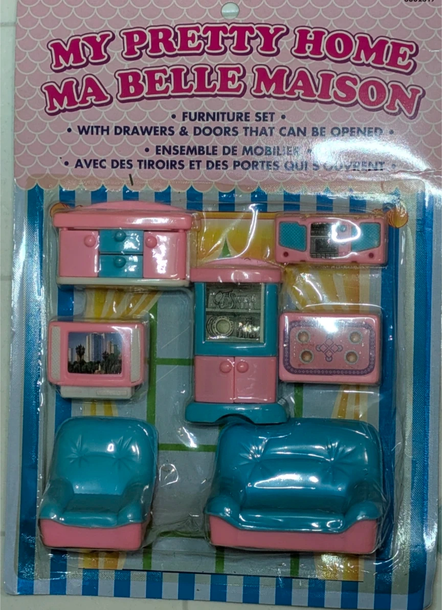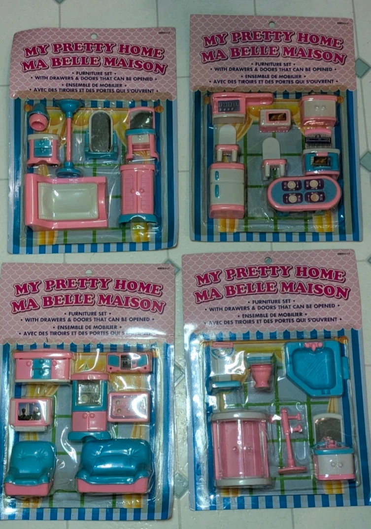 My Pretty Home dollhouse furniture. These are miniature furniture sets for playhouses! They feature pink and teal colours. All sets have drawers and doors that can be opened. Perfect for a dollhouse!