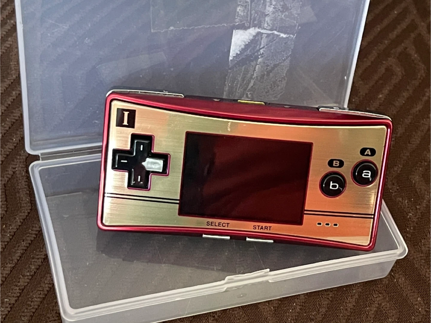 This is a Nintendo Game Boy Micro, Happy Mario 20th Anniversary edition in red and gold. It's a compact handheld gaming device. It includes the 'Onimusha Tactics' game cartridge and accessories and charger.