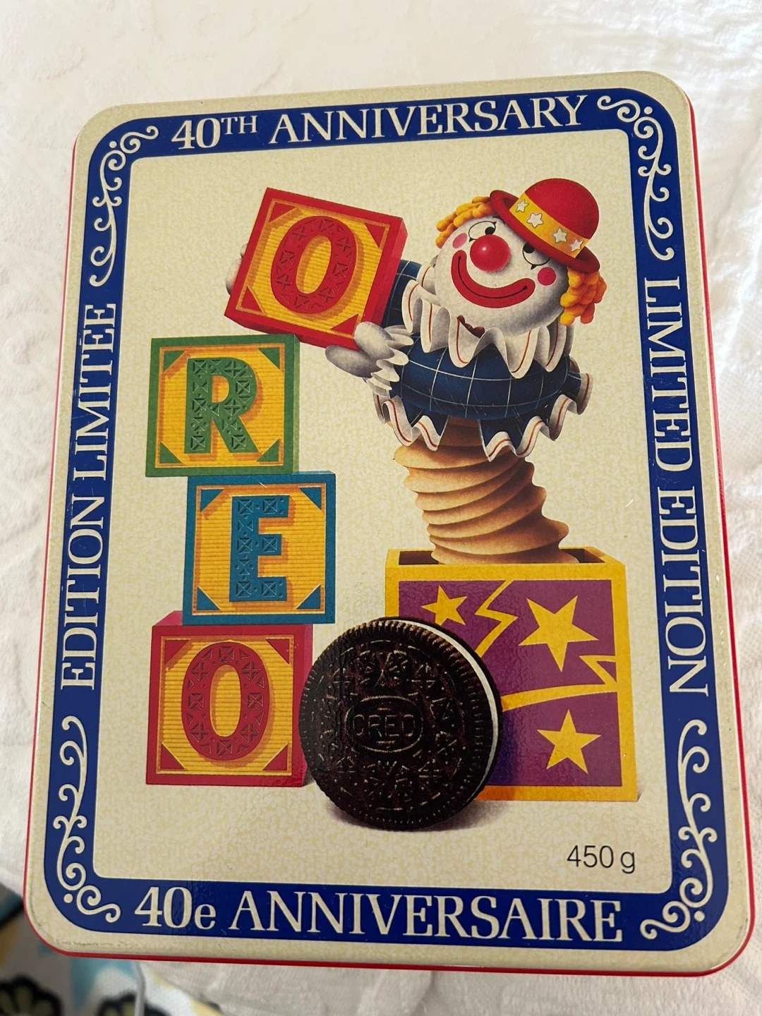 This is an Oreo 40th Anniversary limited edition tin. It once contained 450g of cookies. This collectible tin would be a fun find for any Oreo enthusiast!