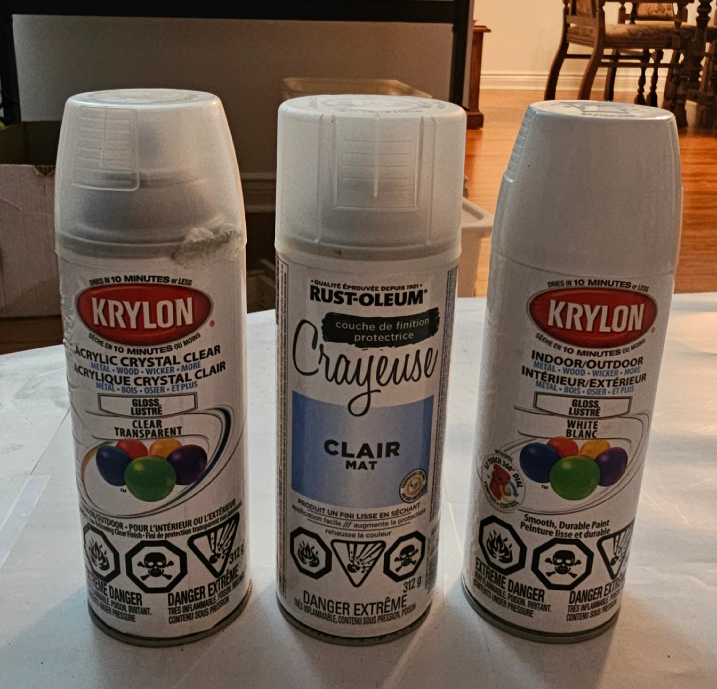 Selling a few cans of spray paint! There's a can of Krylon Acrylic Crystal Clear, a can of Rust-Oleum Crayon Clair Mat, and a can of Krylon Indoor/Outdoor White. Perfect for your next project