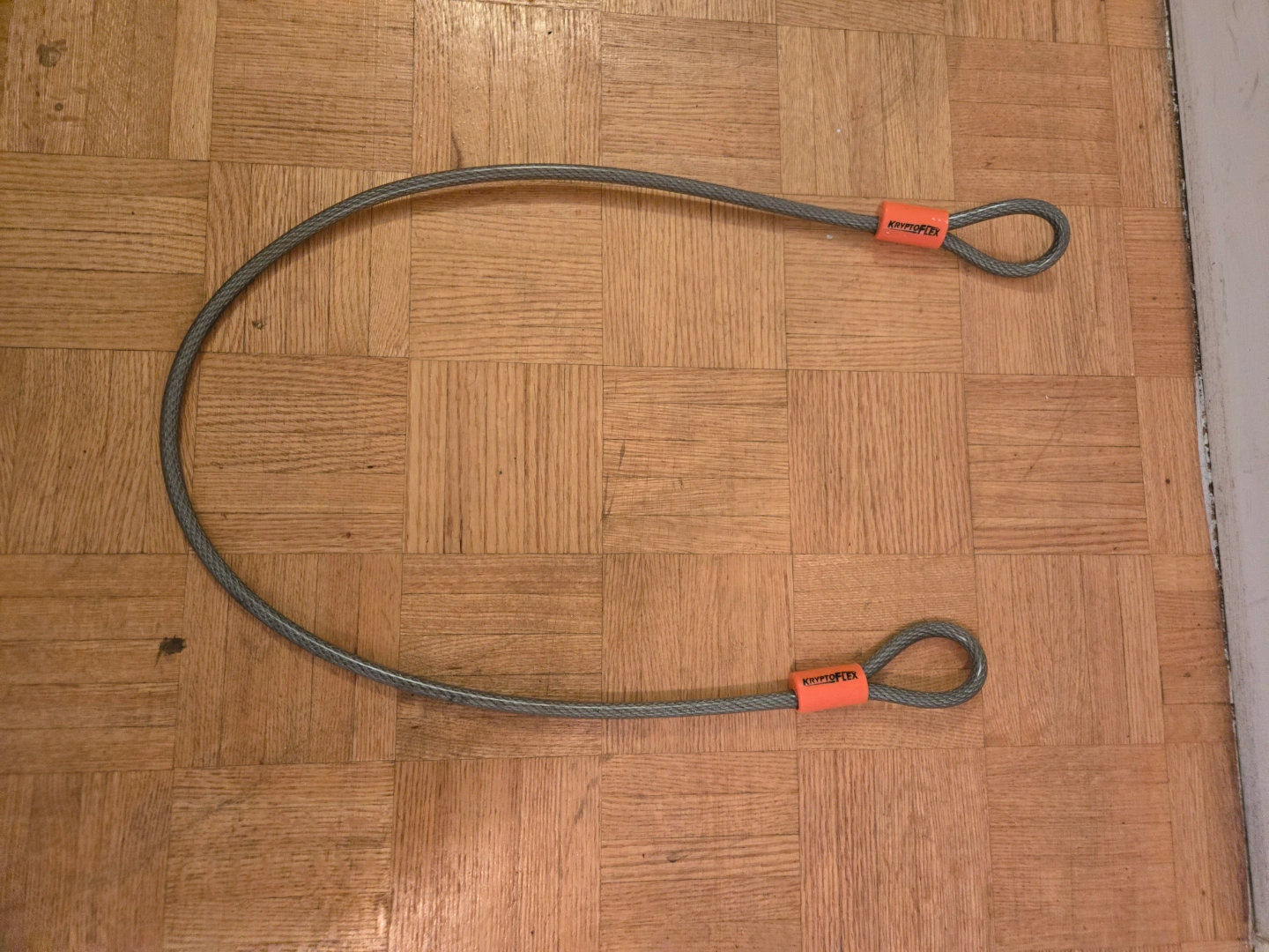 159Grey cable bike lock, looped on both ends. Orange protective sleeves present. A sturdy cable + lock combo like this can bring peace of mind.