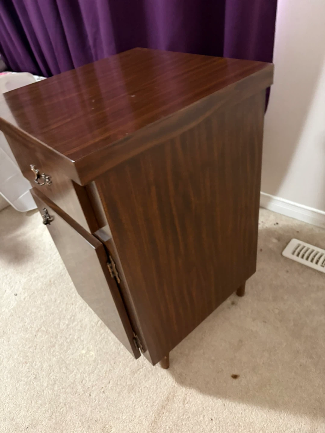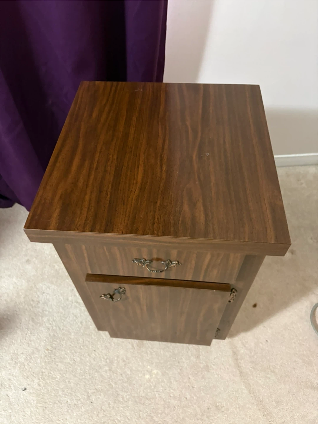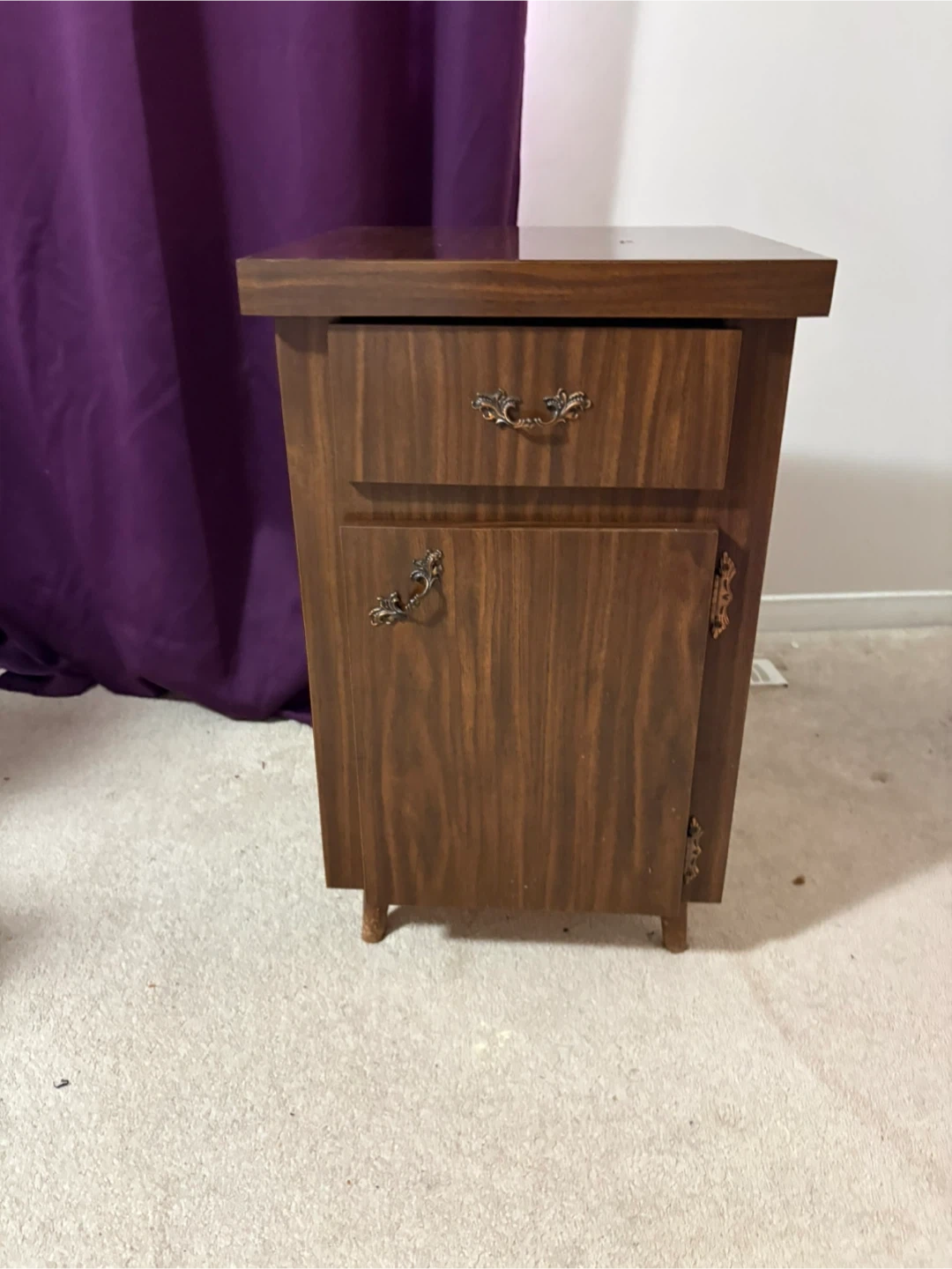 This vintage-style wooden bedside table has a single drawer and a cabinet door. It's a nice size for next to a bed or sofa. Wood finish with ornate drawer pulls.