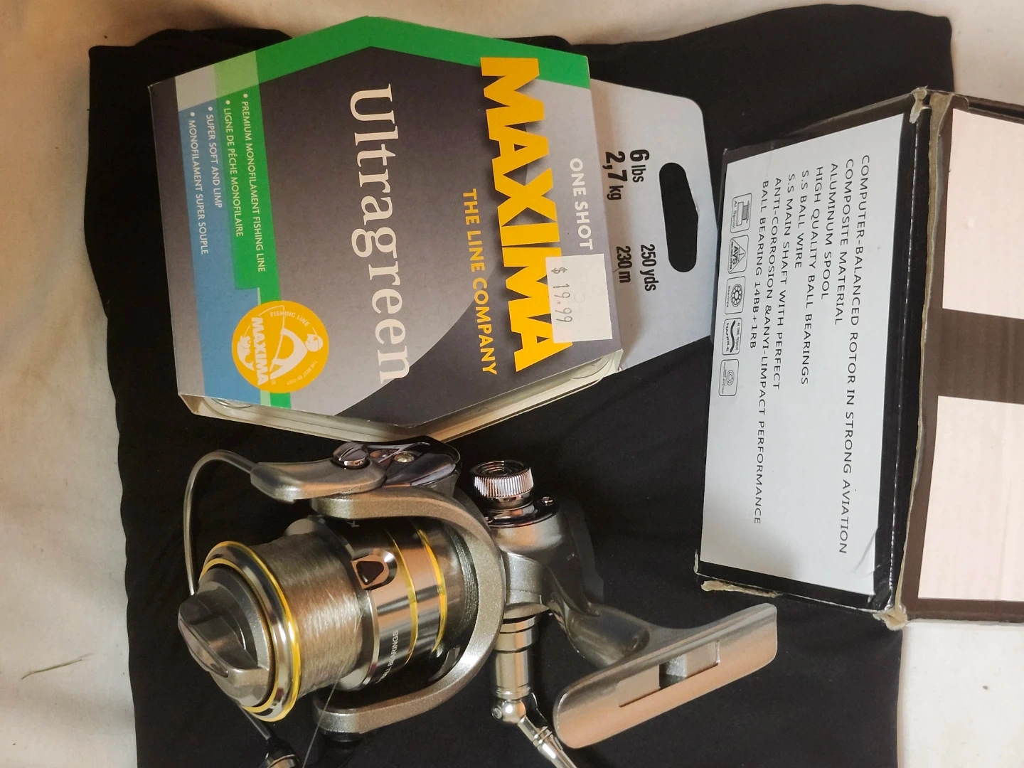 Comes with a spool of 6lb/2.7kg Maxima Ultragreen (clear) that is on the reel. And one spare spool.