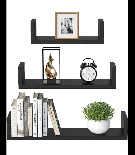 Three black floating shelves with a U-shaped design. Perfect for displaying your favourite decor items.