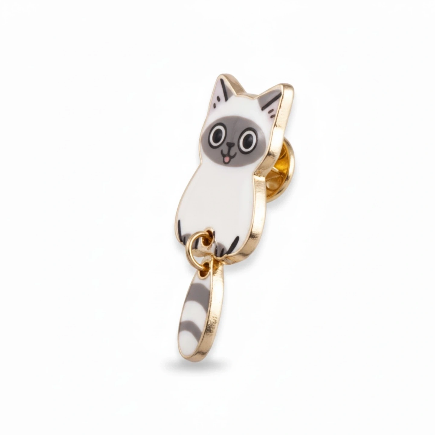 Features a playful cat with a dangling tail and a fish skeleton. Metal pin backing.