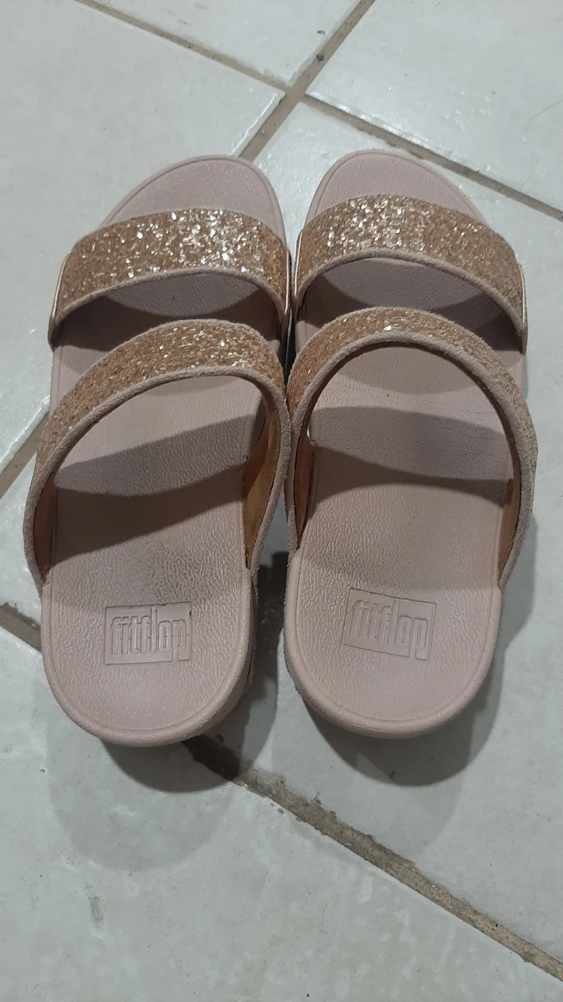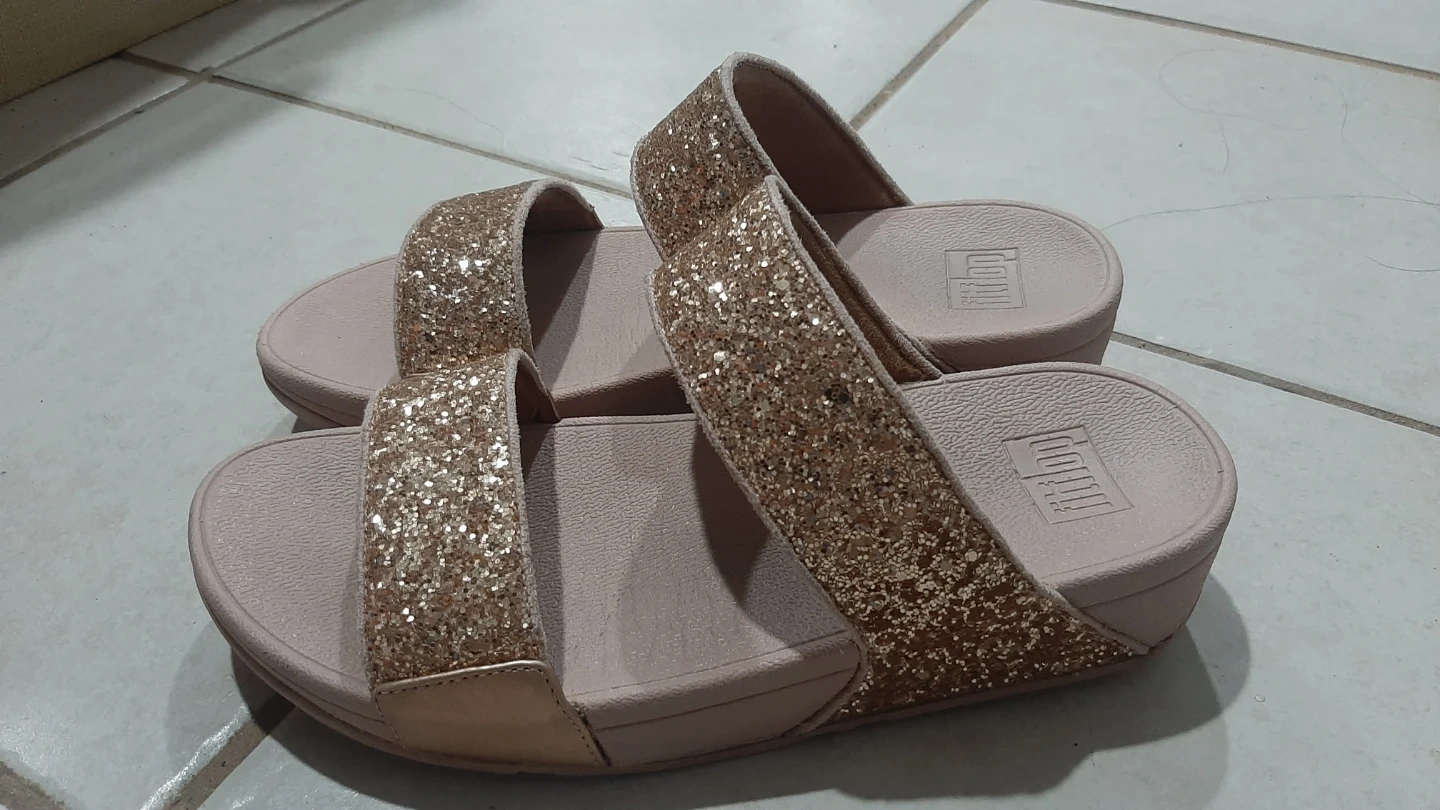 FitFlop women's slides with glitter straps. Rose gold color. Made in Vietnam. EU size 40, US size 9. Comfortable and stylish!