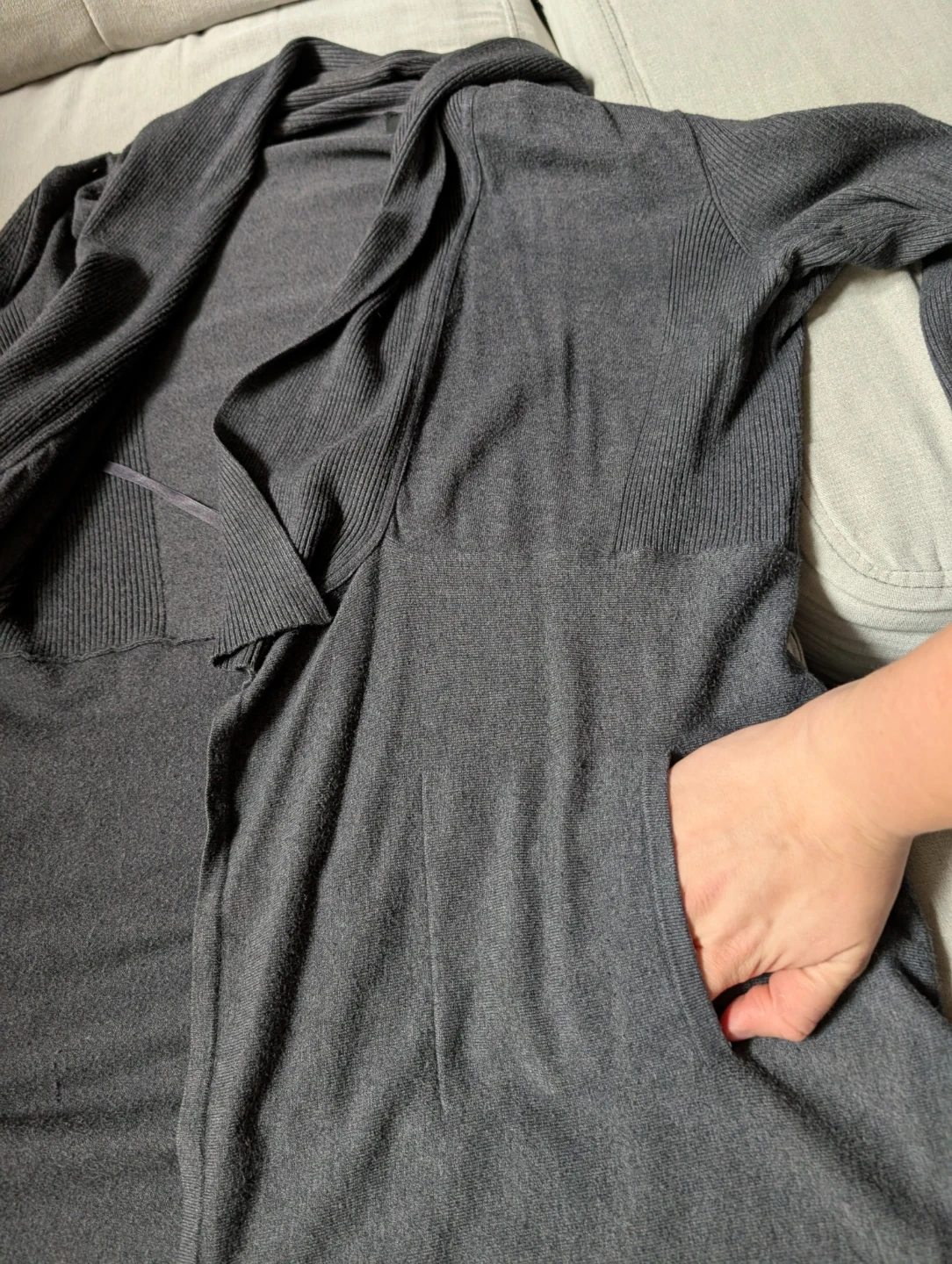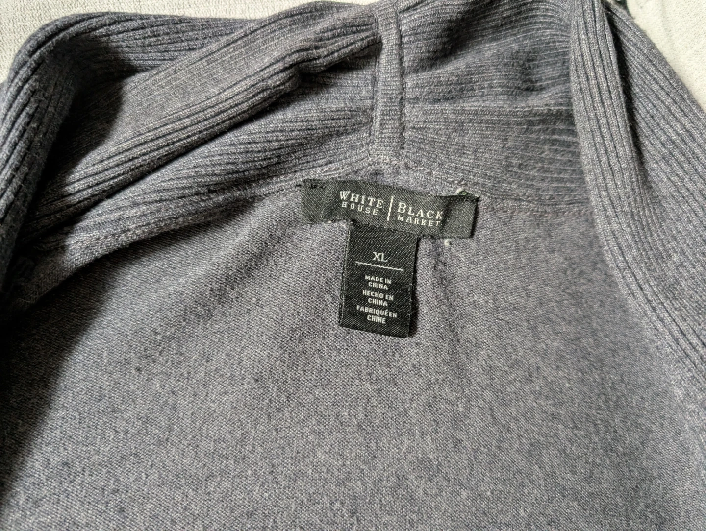Cozy grey cardigan from White House Black Market. It's made with a blend of 77% viscose, 20% nylon, and 3% polyamide. Includes two front pockets.