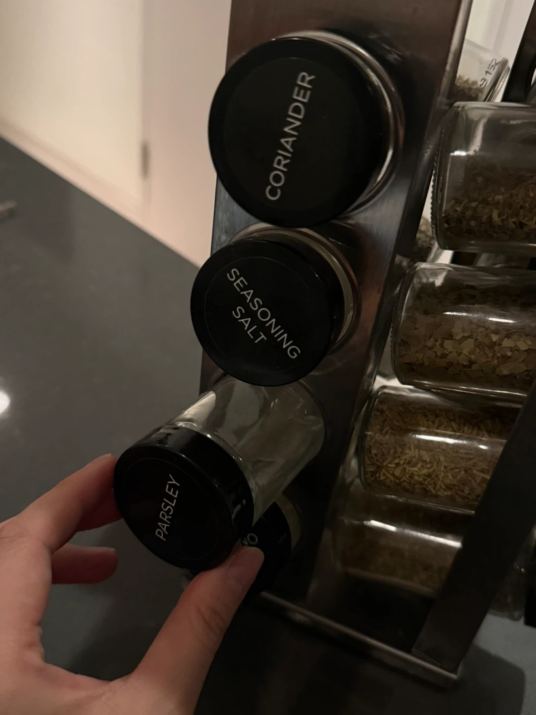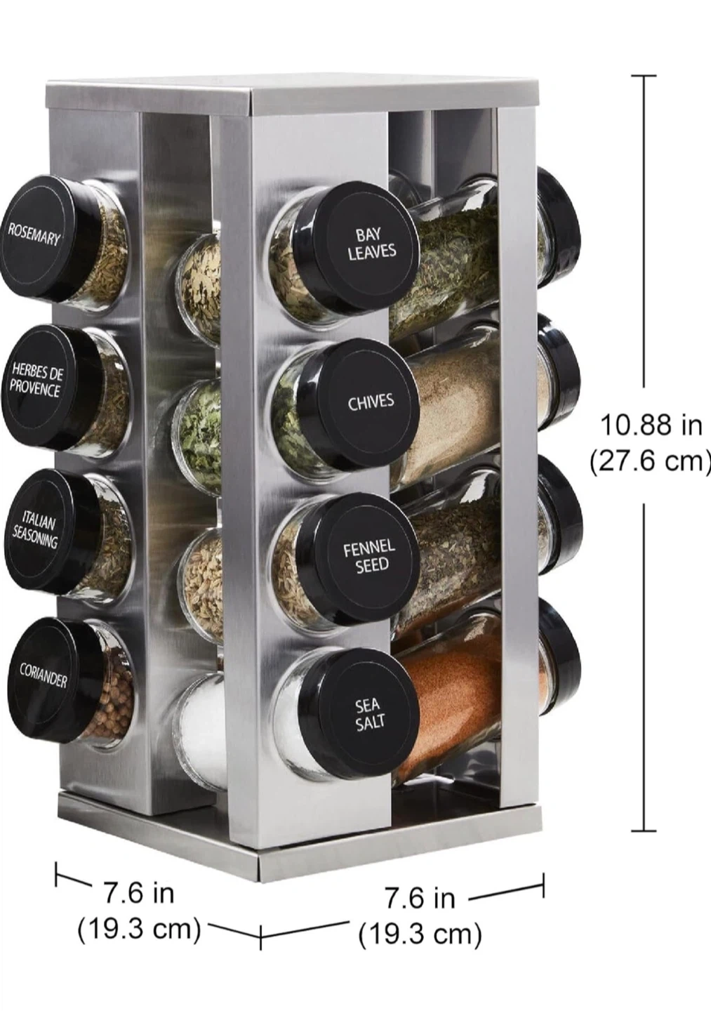 (No Parsley) This 16 jar spice rack comes filled with various spices. It features a stainless steel construction and includes labels for each jar. The rack measures 7.6 x 7.6 x 10.88 inches.