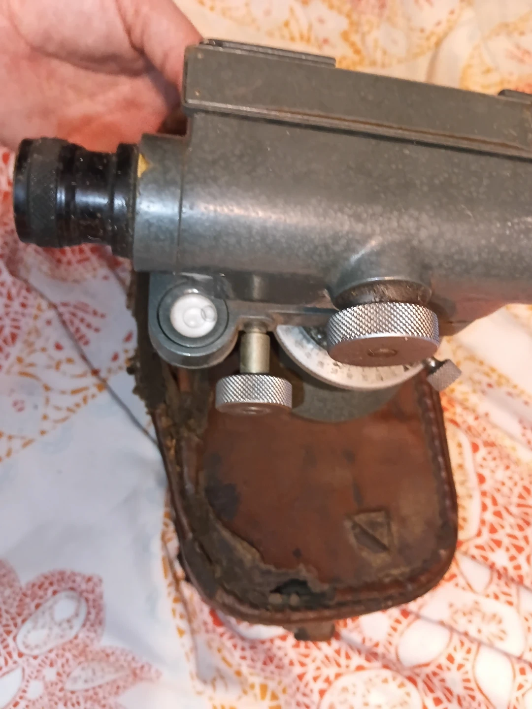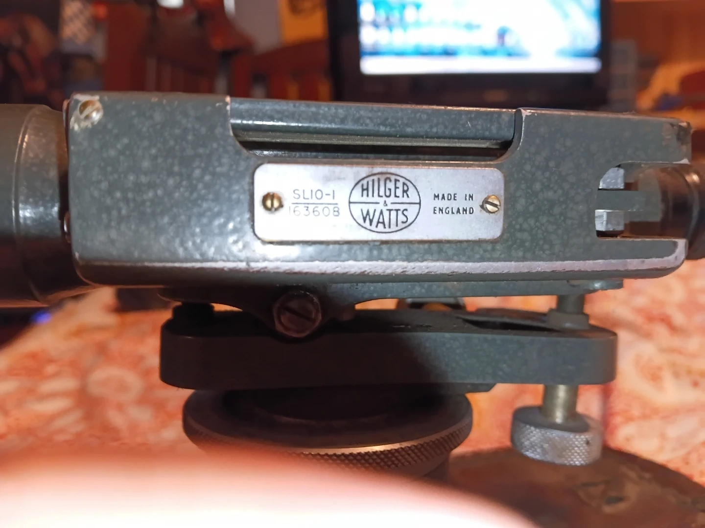 This is a Hilger & Watts SLI0-1 surveying level, made in England. It's a vintage instrument with a metal body and comes with its original leather case. This level is useful for precise land measurements and construction projects.