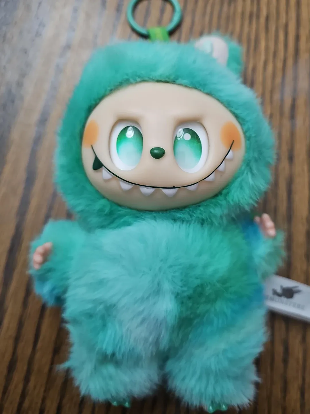 This is a Pop Mart Kasing Lunar Monster plush keychain. It's a fuzzy teal monster with a happy smile and big green eyes. It comes with a loop for attaching to bags or keys.