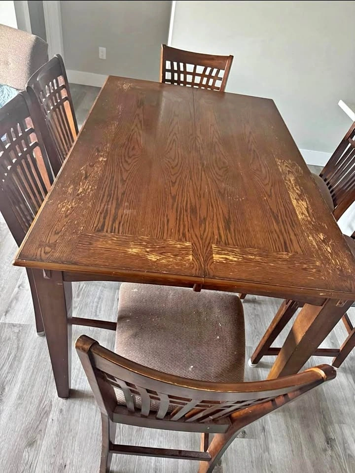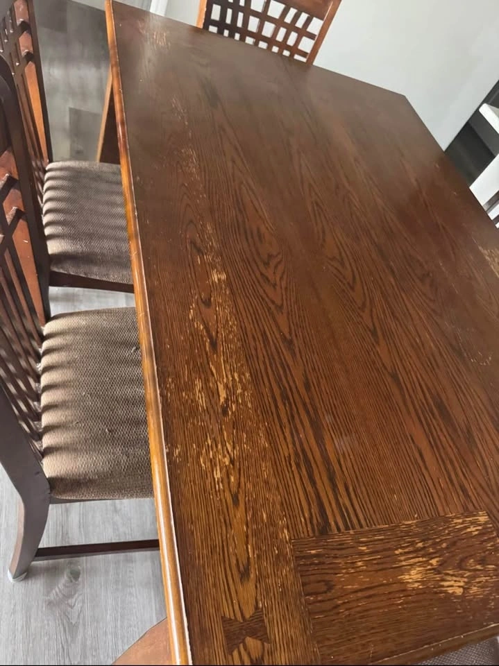 Selling a solid wood dining table with 2 chairs. Very sturdy and good quality real wood. Perfect for a dining room or kitchen. The table shows some normal wear on the surface, but it is strong and can easily be refinished if desired. Includes table + 2 chairs. Solid wood (not particle board). Comfortable cushioned chairs. Great for family dining. Pickup in Moncton / Riverview area. Price: $120 (or best offer)