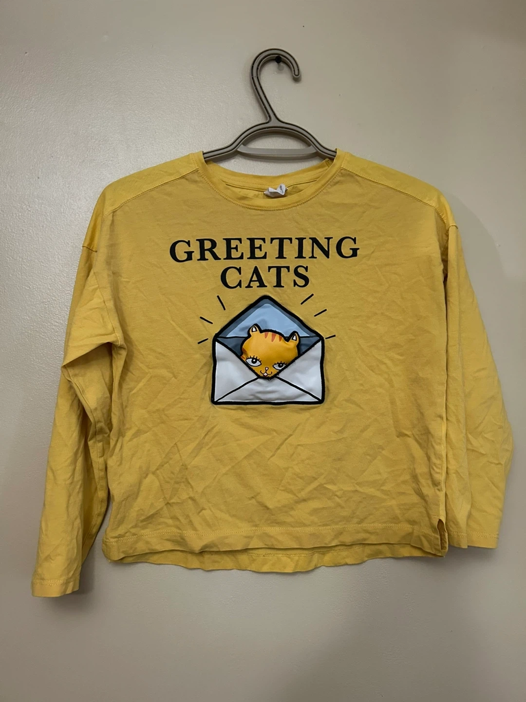 This is a cute, previously enjoyed Zaba Kids long-sleeve shirt, perfect for a young one with a sense of humour! It's a striking yellow colour, features an interactive cat in an envelope with the words "Greeting Cats".