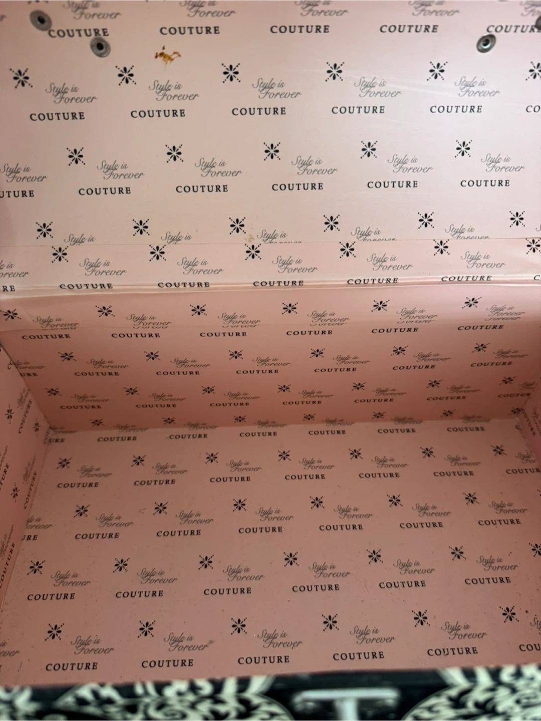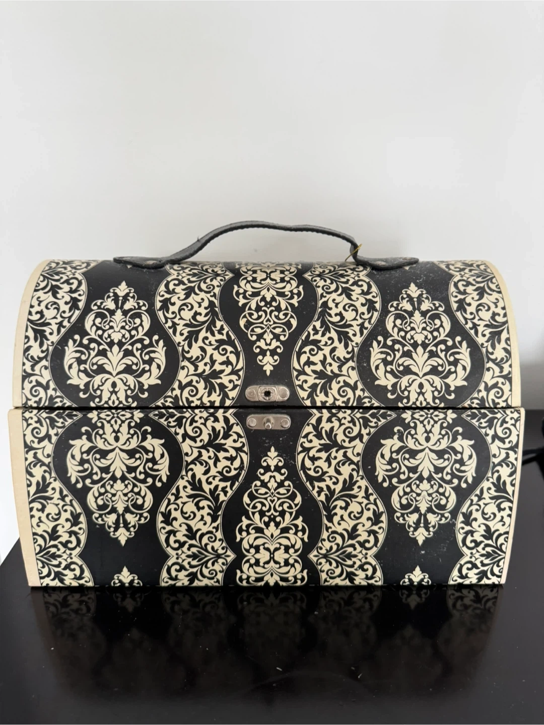 This is a decorative vanity case with a vintage-inspired black and cream damask pattern. It's ideal for storing jewelry or small accessories. The interior lining features a repeating 'Style is Forever COUTURE' print.