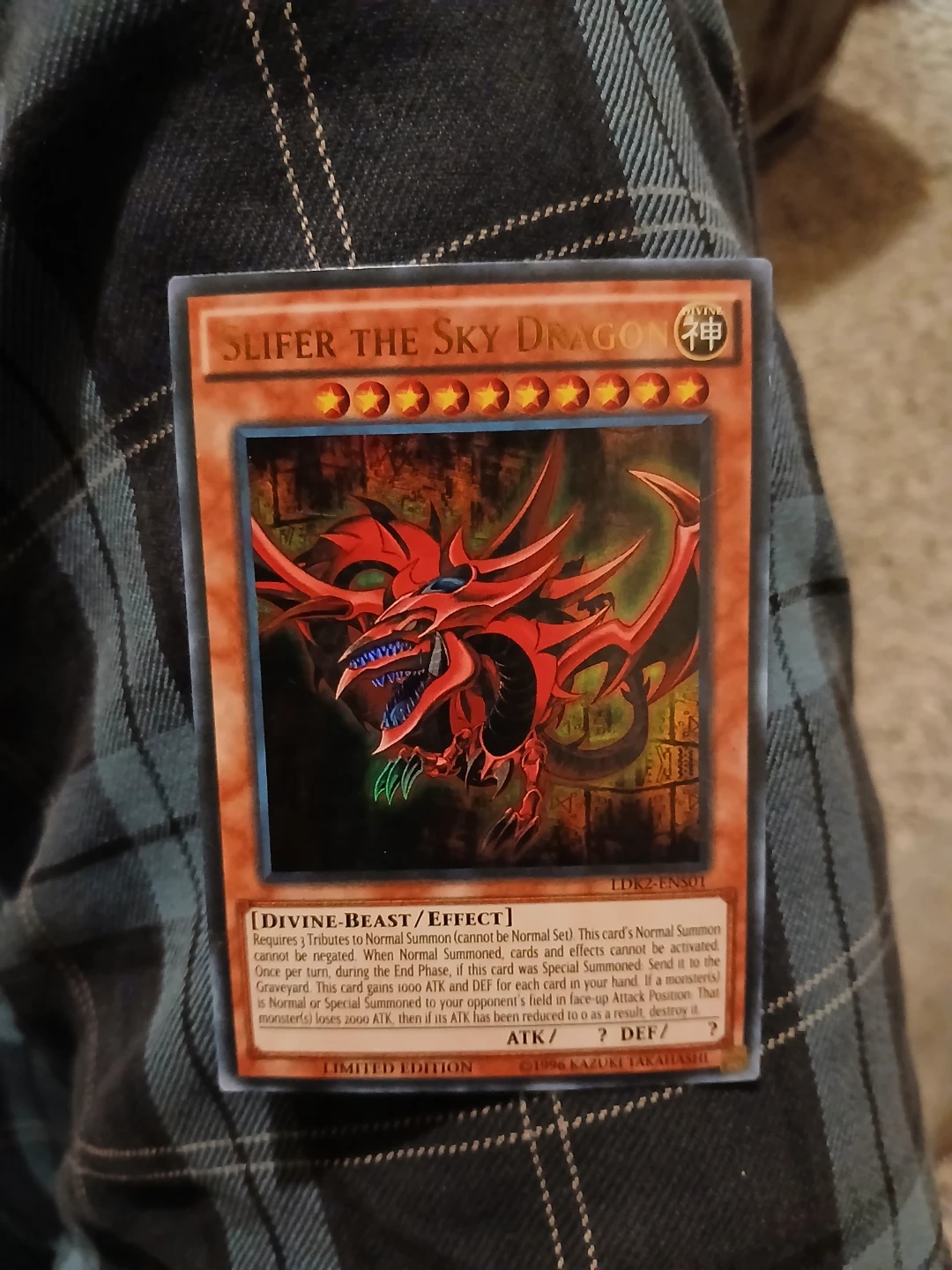 Slifer the Sky Dragon card from Yu-Gi-Oh! It's a Divine-Beast/Effect monster. A collectible trading card from Konami. Cash only. Pick up or meet up in public place.