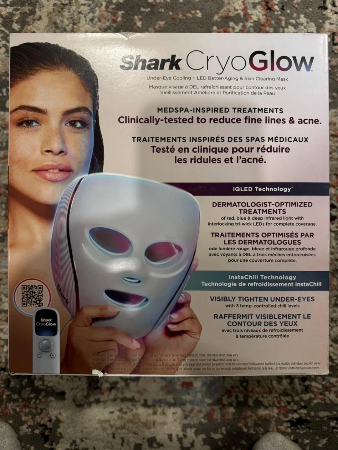 This Shark CryoGlow mask uses LED light therapy to target fine lines and acne. It features dermatologist-optimized red, blue, and infrared light with InstaChill Technology. It has 3 temp-controlled chill levels for visible under-eye tightening.
