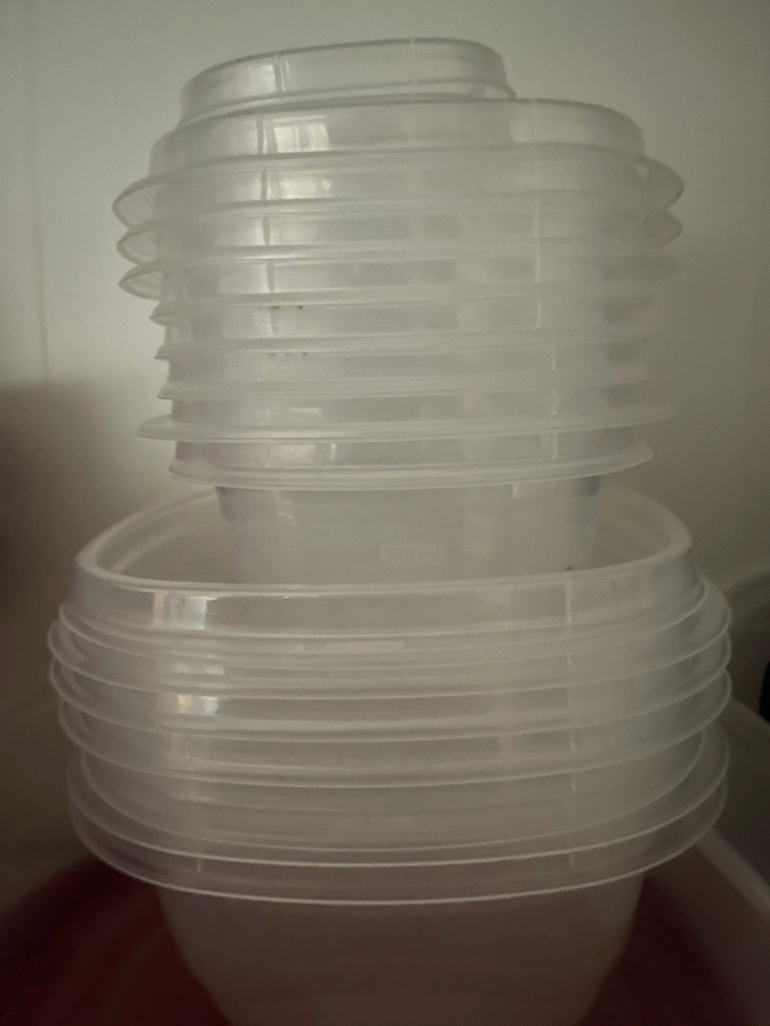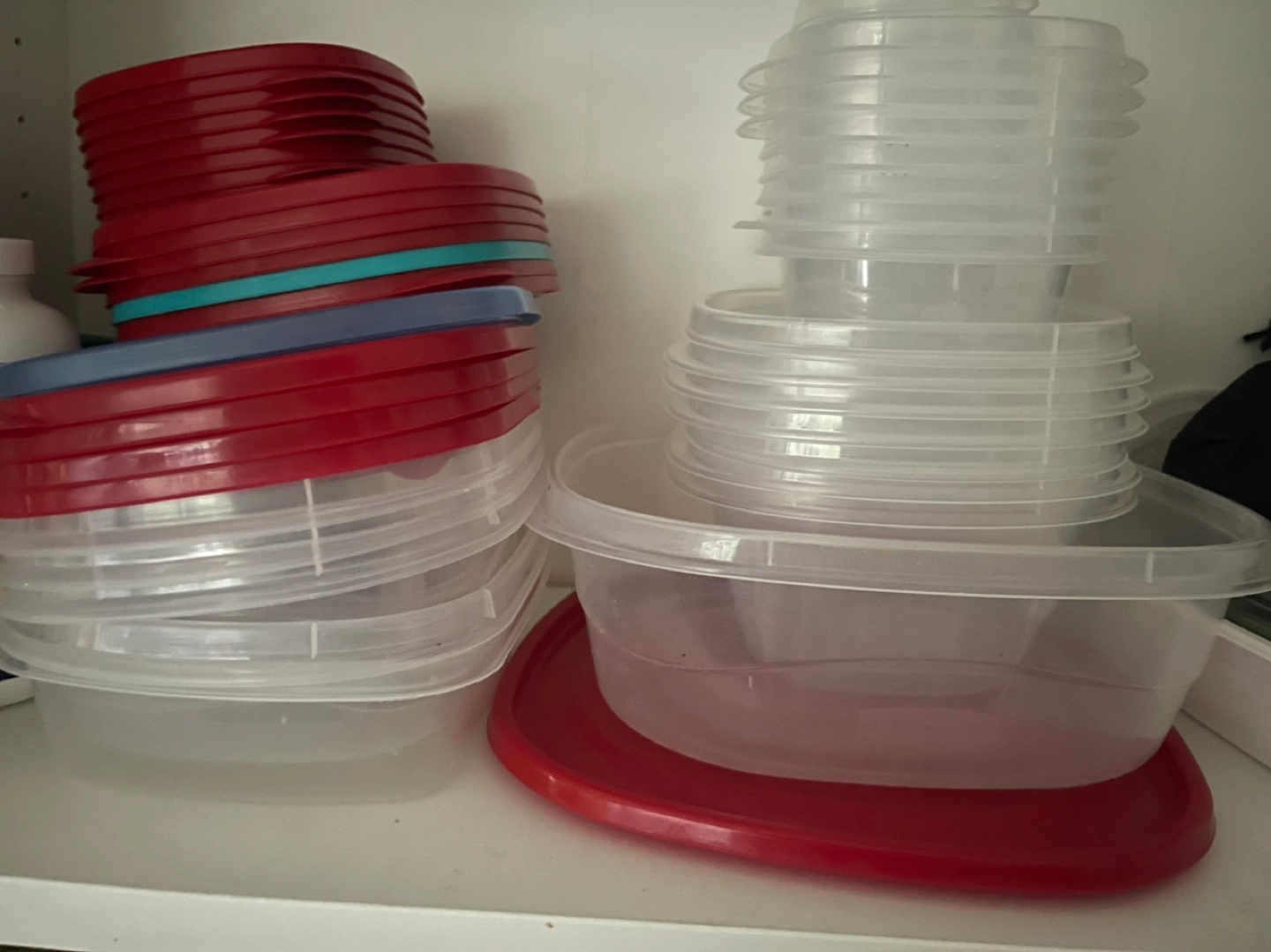 Set of Tupperware storage containers. Various shapes and sizes. Some have red lids, some have clear lids, some have both. 26 pieces different sizes
