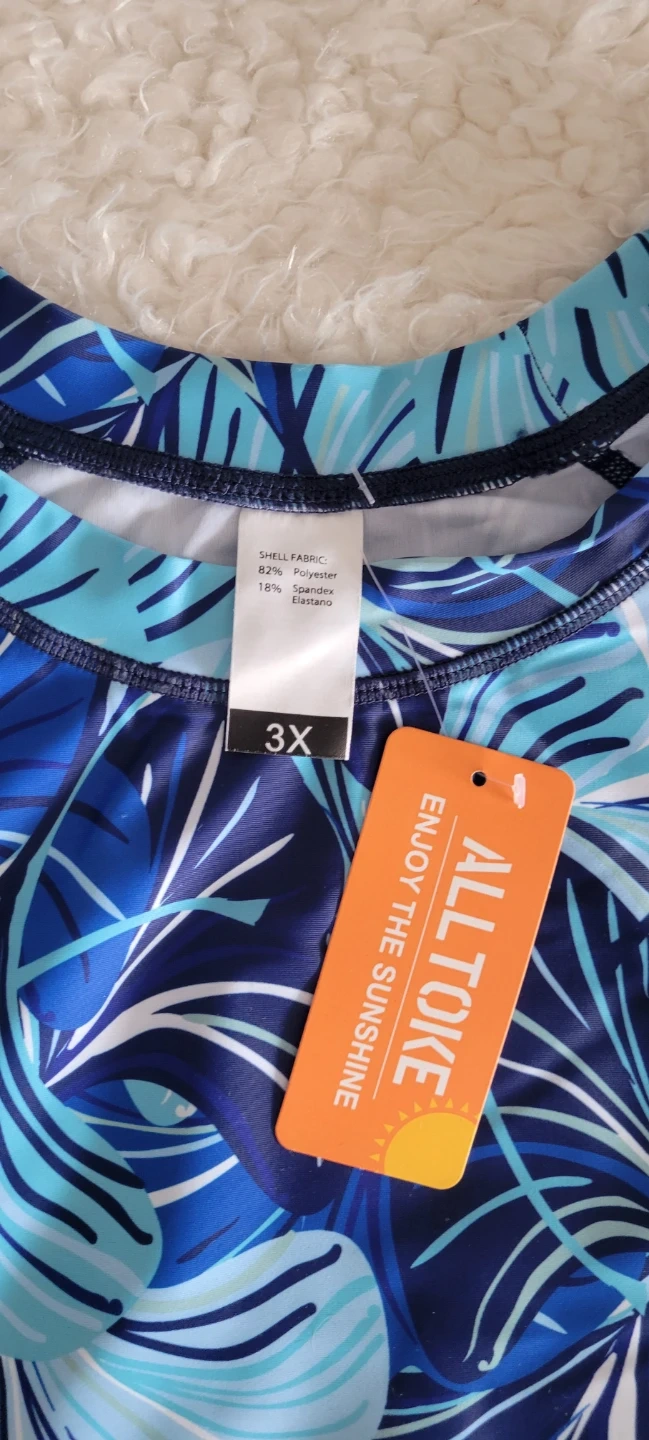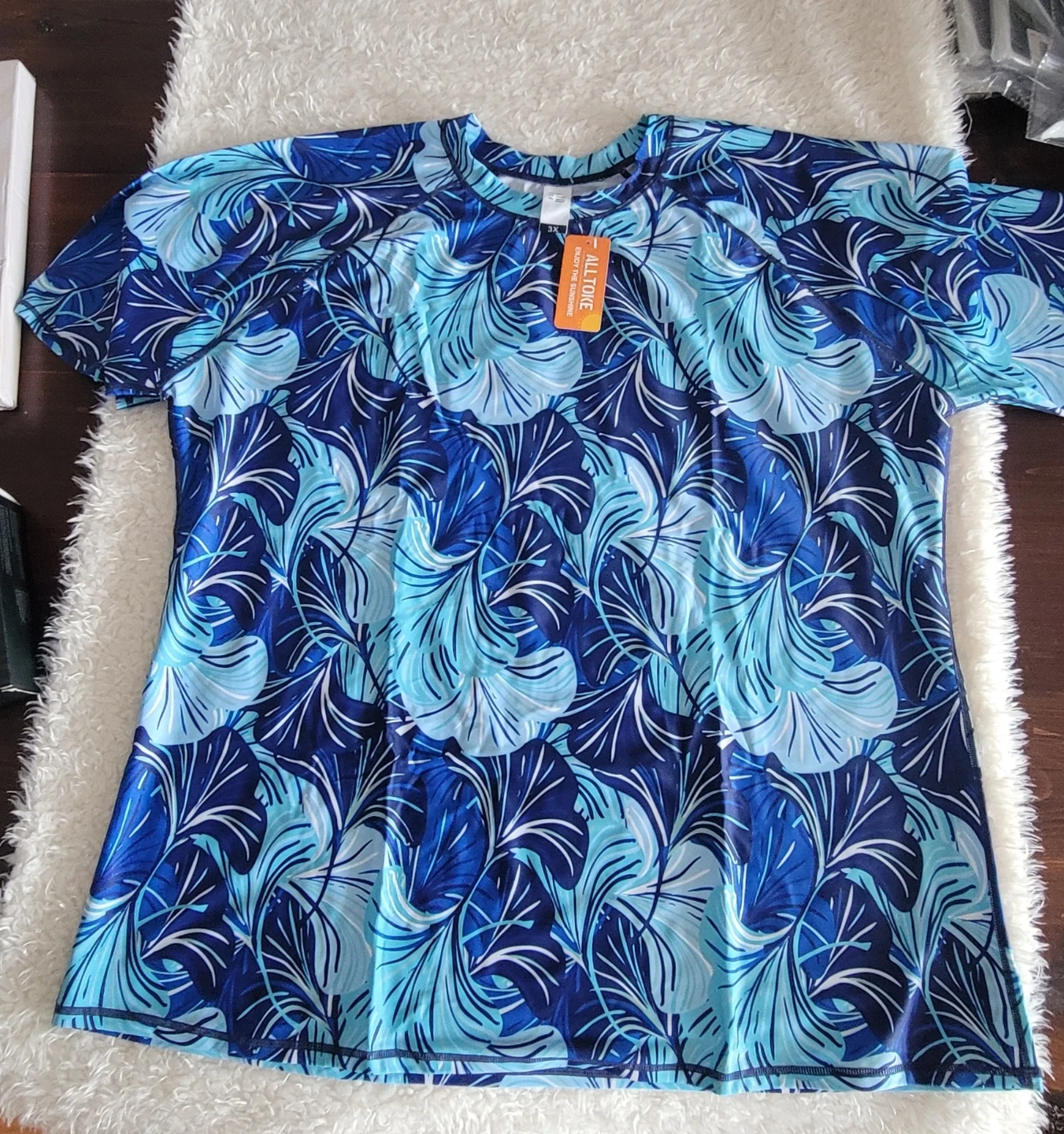This brand-new ALLTOKE rash guard features a vibrant blue leaf print. It's made with a polyester and elastane blend for comfort and flexibility. UPF 50+ sun protection, quick drying, and moisture-wicking properties make it great for beach days or outdoor activities.