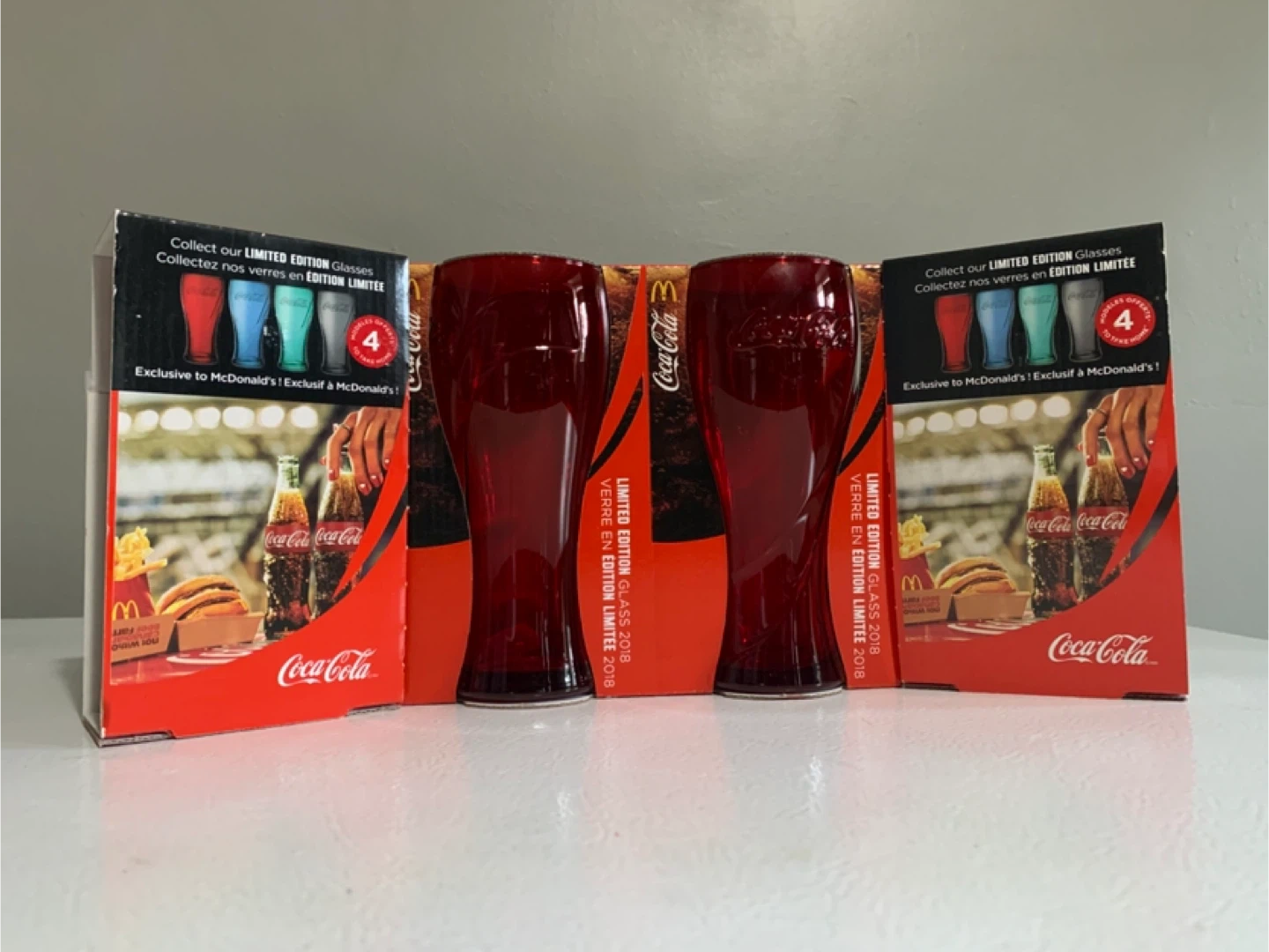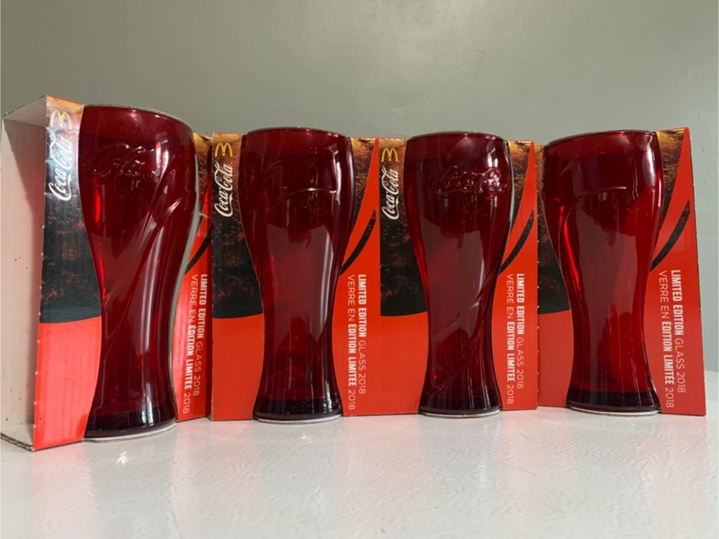 Collect these limited edition Coca-Cola glasses from McDonald's in 2018. These are a deep ruby red colour and have the iconic Coca-Cola logo embossed on them. They come with their original packaging.