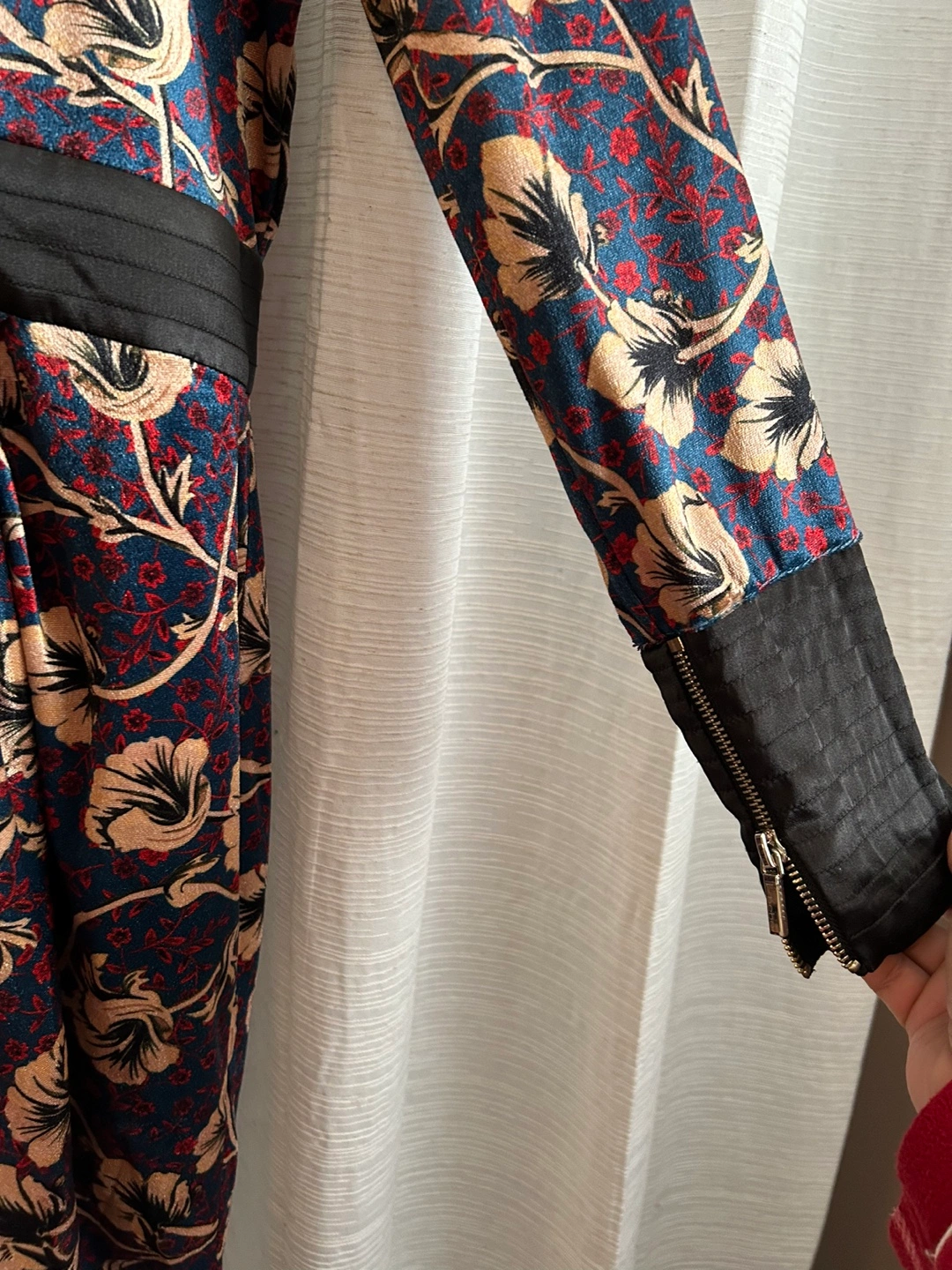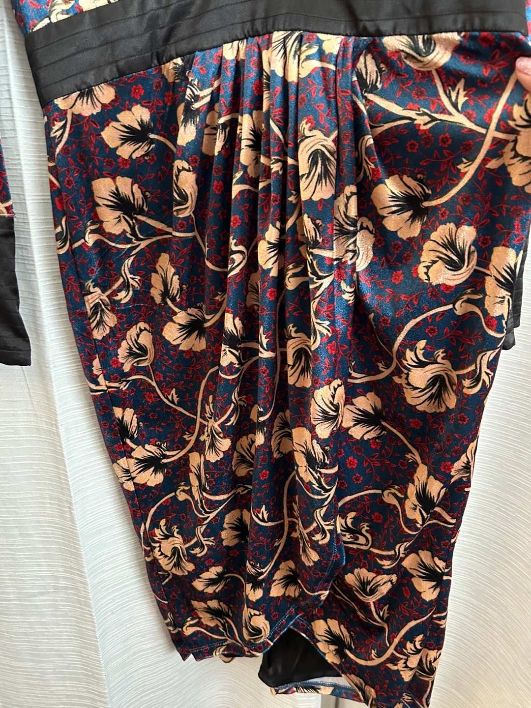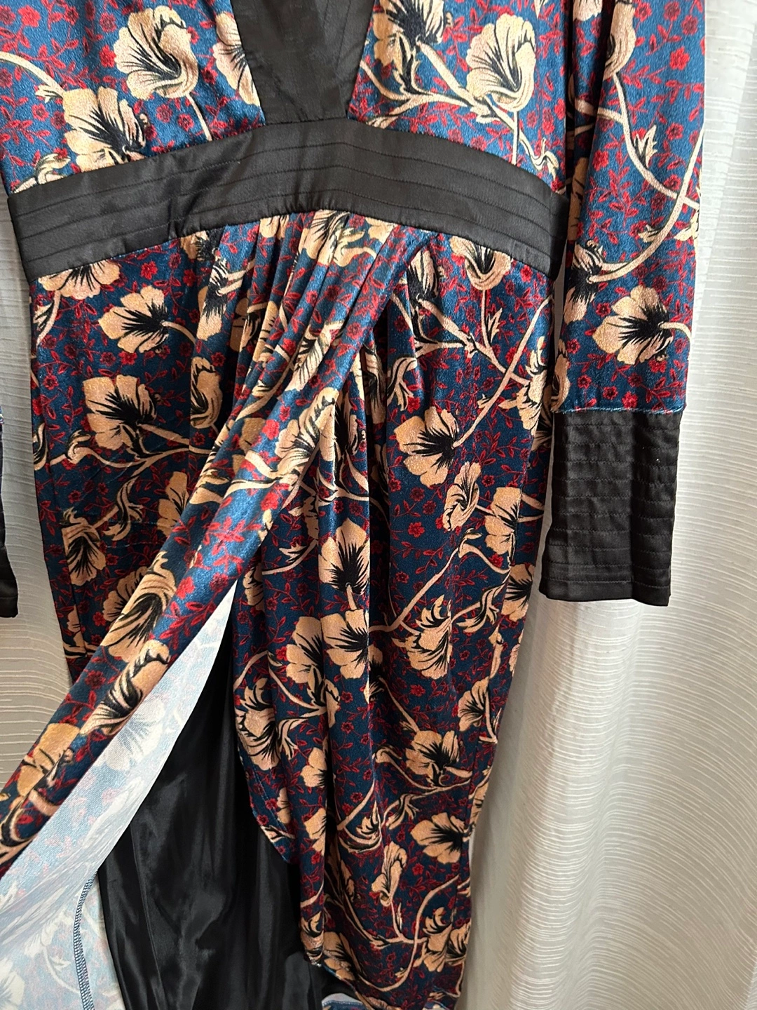 Long-sleeved dress with a floral pattern and a v-neck. Features black accents on the neckline, waist, and sleeves.