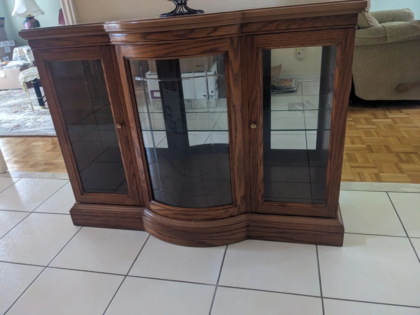 A lovely wooden display cabinet with glass doors. It has three sections, perfect for showcasing your collectibles or dishes. A beautiful piece for any living or dining area!