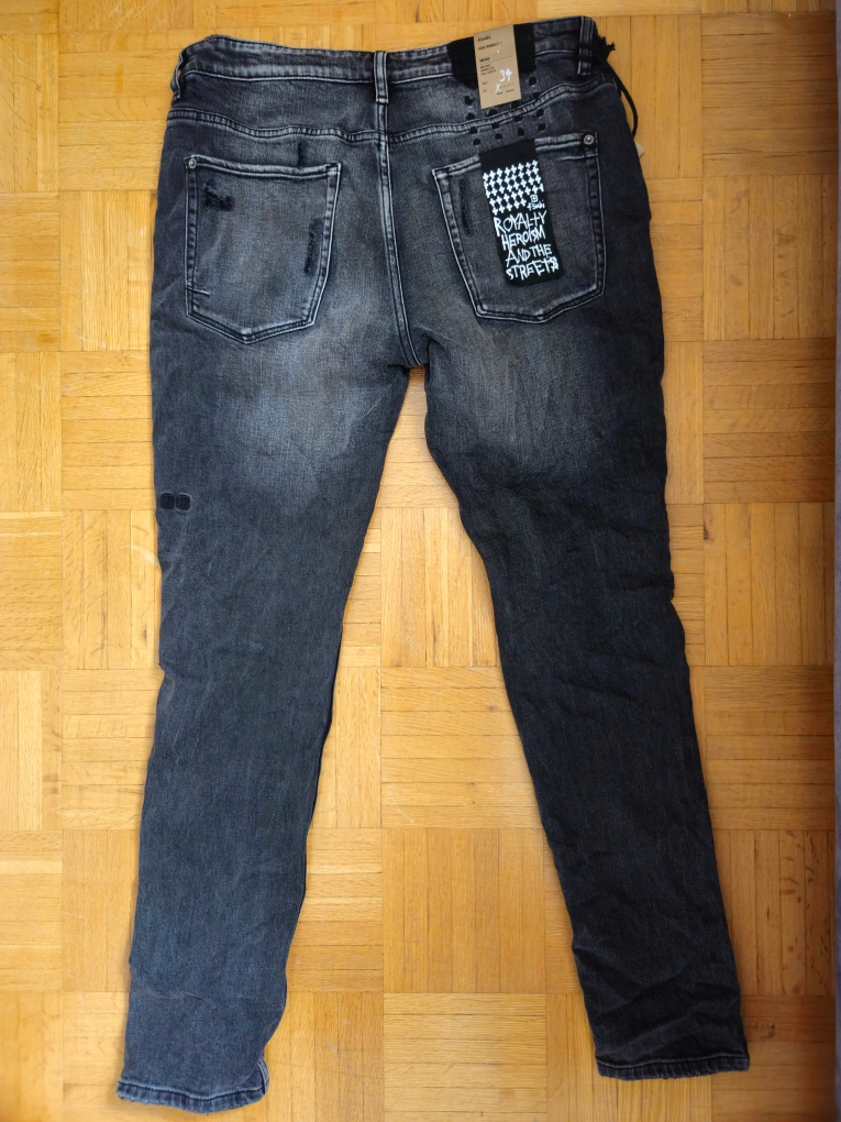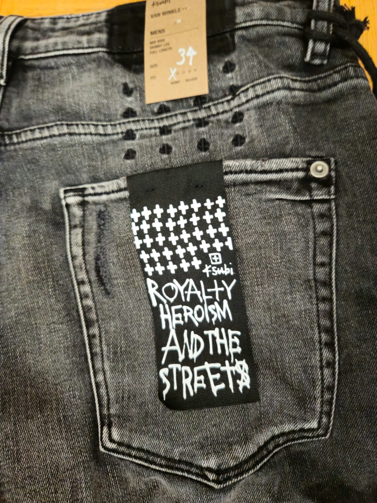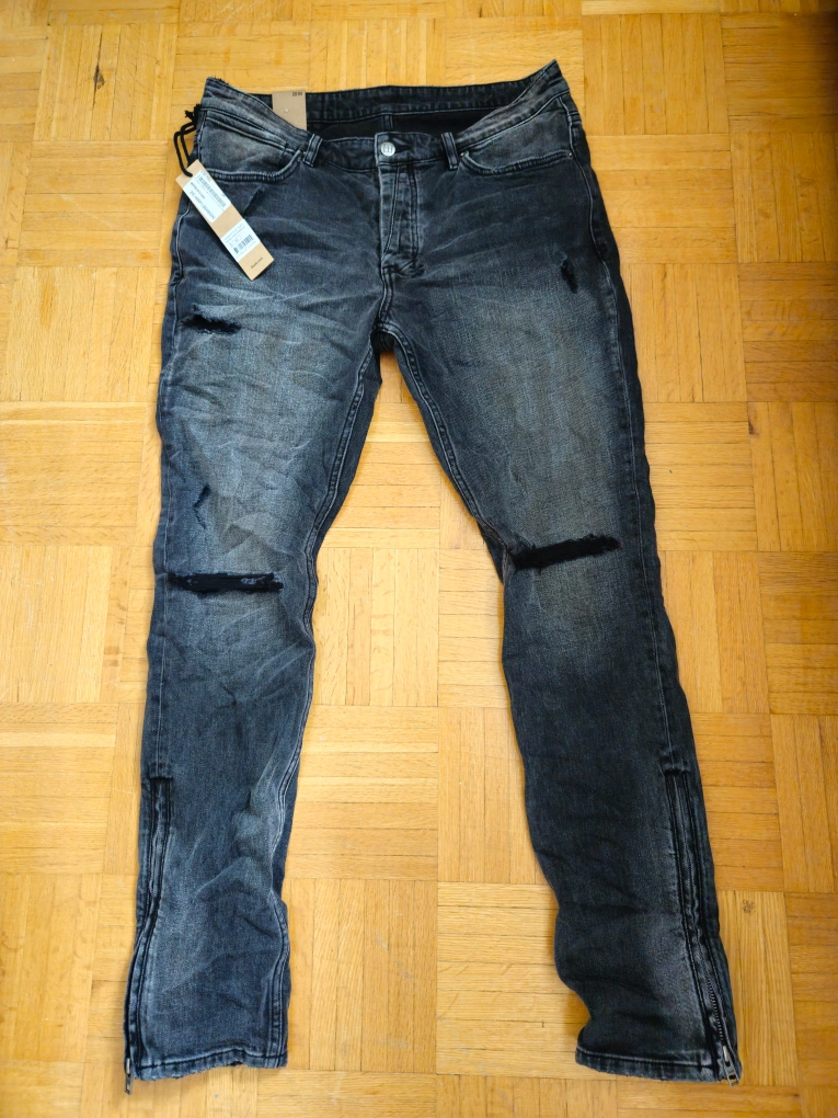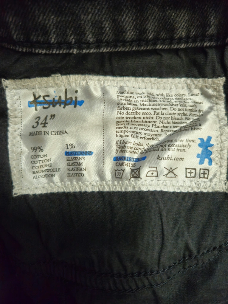 10Selling a pair of Ksubi Van Winkle jeans in size 34. These jeans feature a stylish distressed design and are made of 99% cotton and 1% elastane. They have a unique look with zipper detailing at the ankles and the signature Ksubi branding on the back pocket. A cool addition to any wardrobe!