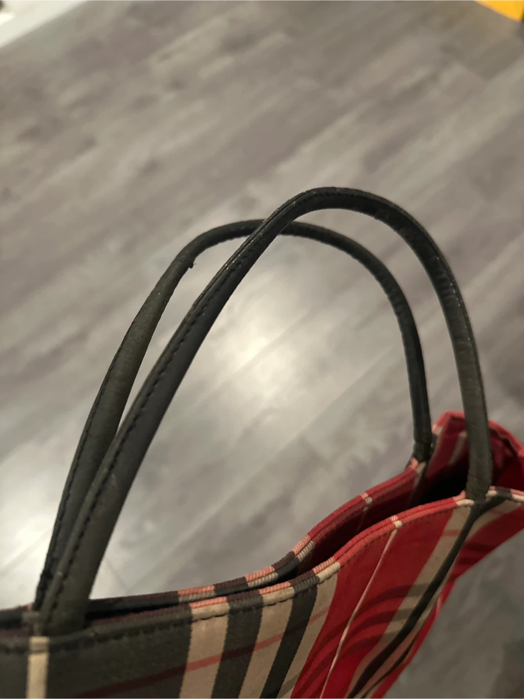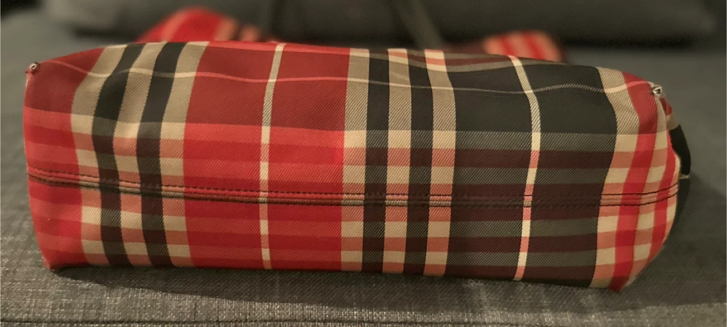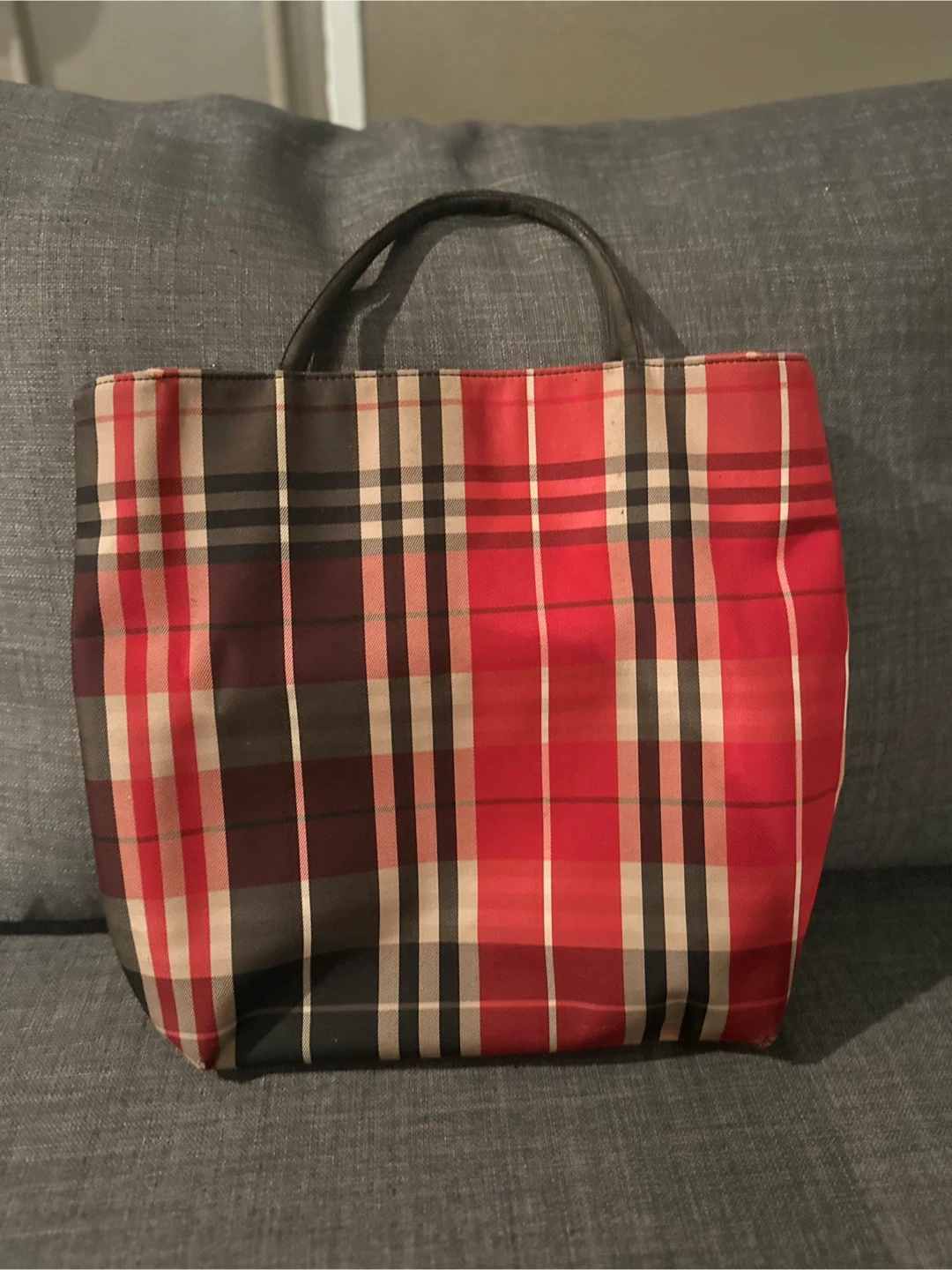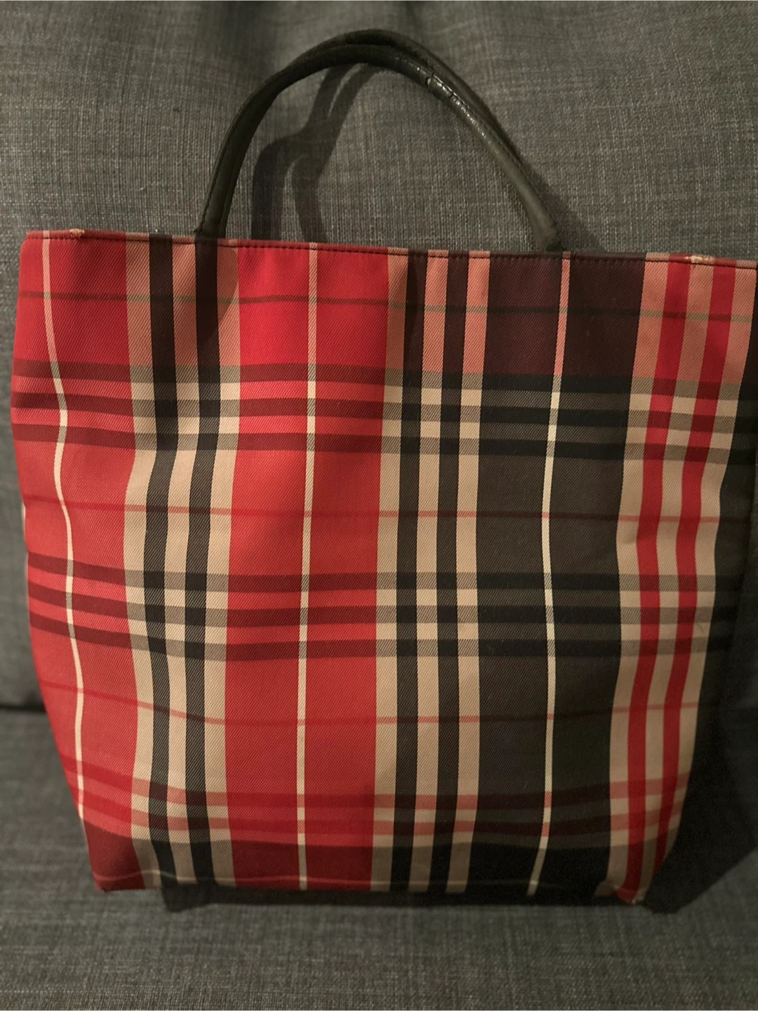 Classic Burberry tote bag with iconic nova check pattern. Red, beige, black, and white plaid design. Leather handles. Spacious interior.
