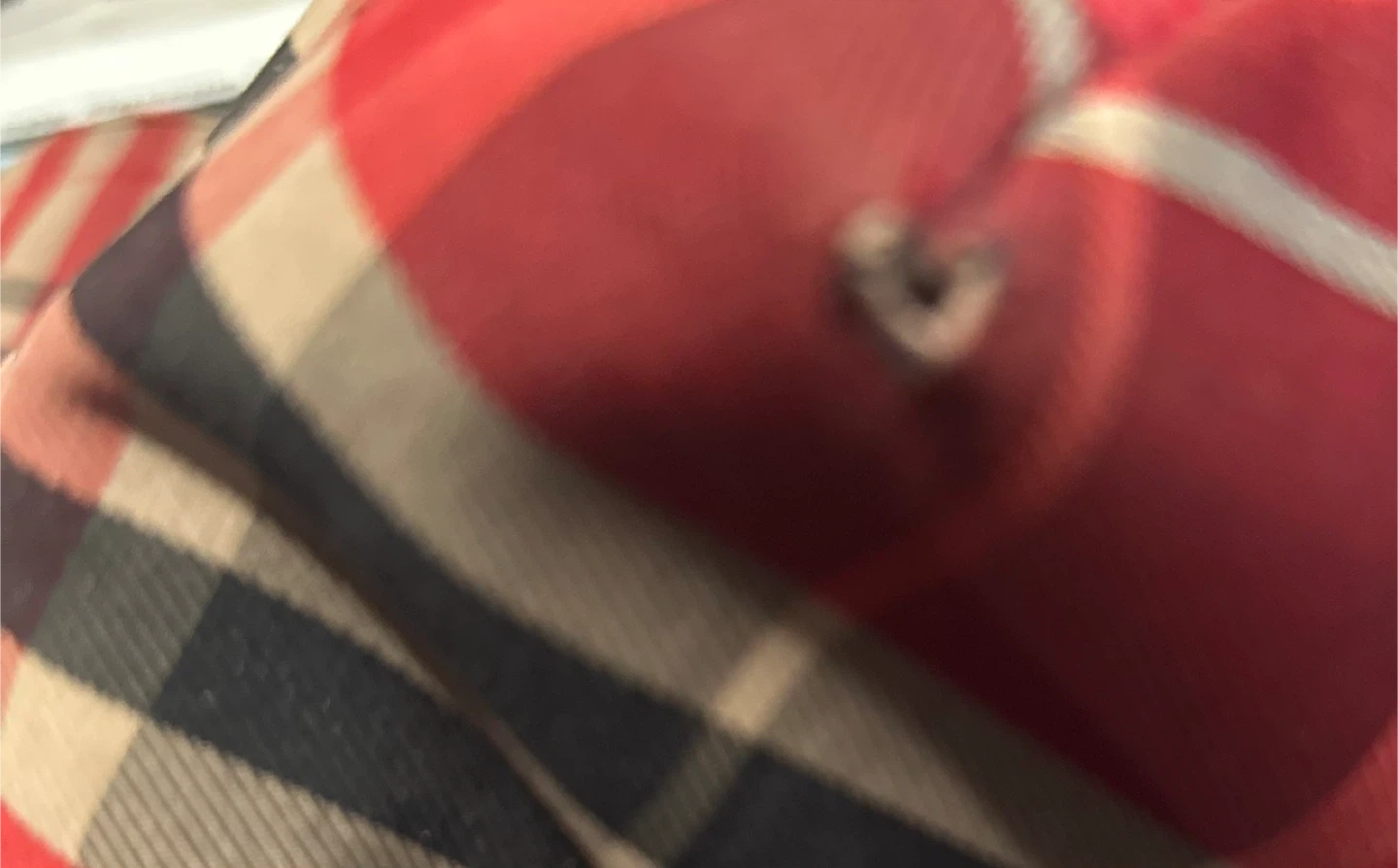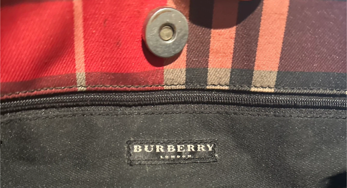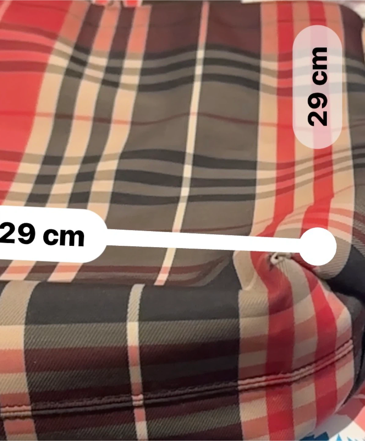 Classic Burberry tote bag with iconic nova check pattern. Red, beige, black, and white plaid design. Leather handles. Spacious interior.